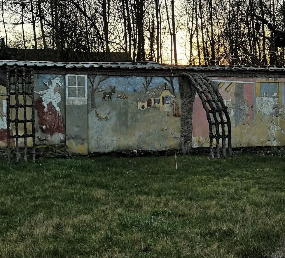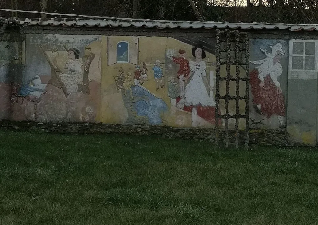 Ma fresque je l'ai commencée une fois que j'ai plus été maire, j'ai été deux ans occupé à cette affaire. A cette époque j'ai pu réaliser de mes mains un bon nombre de sujets en béton peints. Si j'avais eu un peu plus de place j'aurais continué et par exemple j'avais l'idée de me faire une petite mine, j'aurais pu l'installer dans le jardin, mais je voyais que ma femme, bien qu'elle n'ait jamais rien dit à ce sujet, ça lui plaisait pas trop (...)
