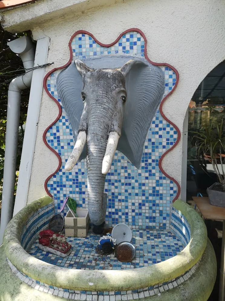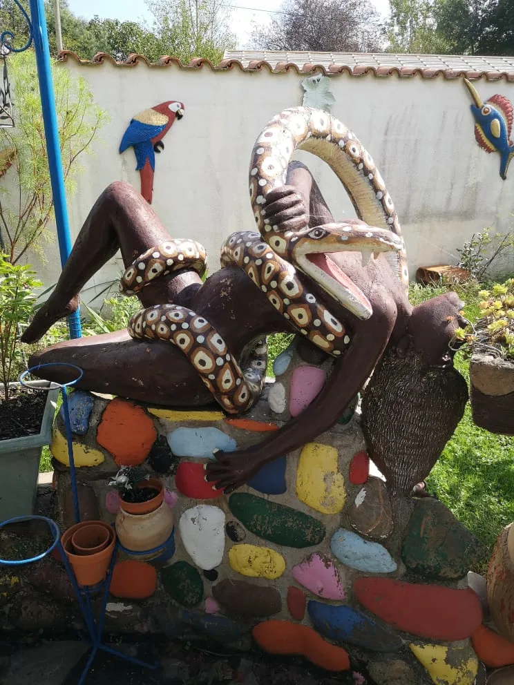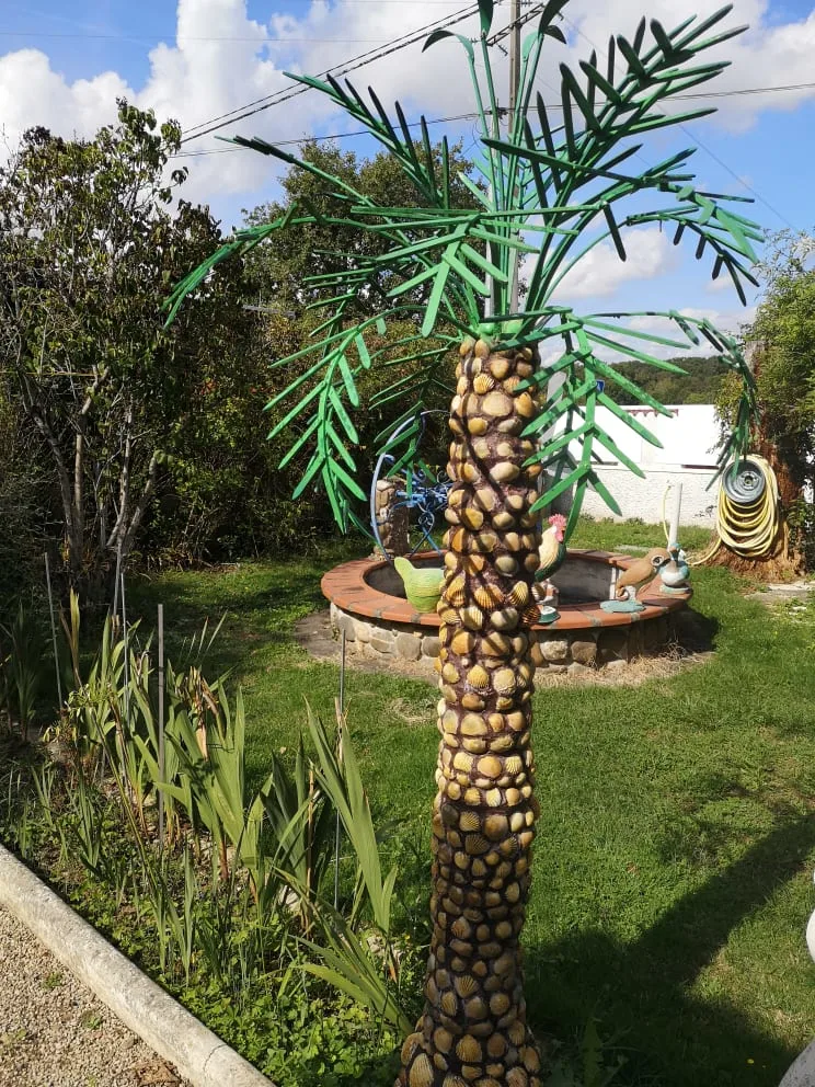Devant l'entrée, on aperçoit une fourmi en pierre et en fer forgé jouant de la guitare. "Ça c'est moi quand j'étais jeune, j'étais musicien et jouais dans un quartet nommé les Gangicalo, il y a 50 ans de ça." Le groupe se produisait lors de fêtes, de réveillons de Noël dans toute la Tunisie.