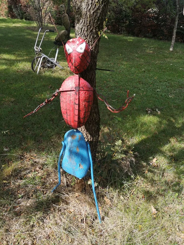 Calogero entreprit de nous faire découvrir d'autres réalisations exposées dans une propriété située à quelques kilomètres de son habitation. Nous retrouvons une fourmilière d'insectes personnifiés élaborés au moyen de pierres rondes ceinturées de fil de fer : une fourmi Spiderman, une porteuse d'eau, une amazone, un cycliste... Ce deuxième terrain, qui abrite aujourd'hui la majeure partie de son œuvre plastique, appartenait à son frère. Calogero en hérita par la suite. Le nouveau maire refusa de lui attribuer un permis de construire de sorte que Calogero décida d'en faire un espace d'exposition, un terrain de jeu, un jardin idyllique pour y passer du bon temps entre amis ou en famille. Il construisit une cabane géante, un manège, une aire de pique-nique pour les enfants. Le terrain était auparavant ouvert à tous; il n'y avait ni portail, ni clôtures, pour délimiter cet espace de jeu. Par malheur, des sculptures disparurent et Calogero se vit contraint de fermer le site au public. Il avait pourtant pensé cet espace comme un lieu libre d'accès, propice au repos et au divertissement. Calogero invita l'école de Fontenille à venir pique-niquer dans le jardin, un exemple parmi d'autres d'altruisme développé dans sa pratique artistique.