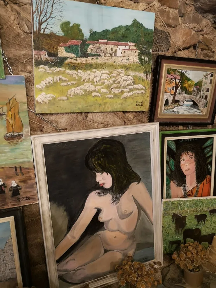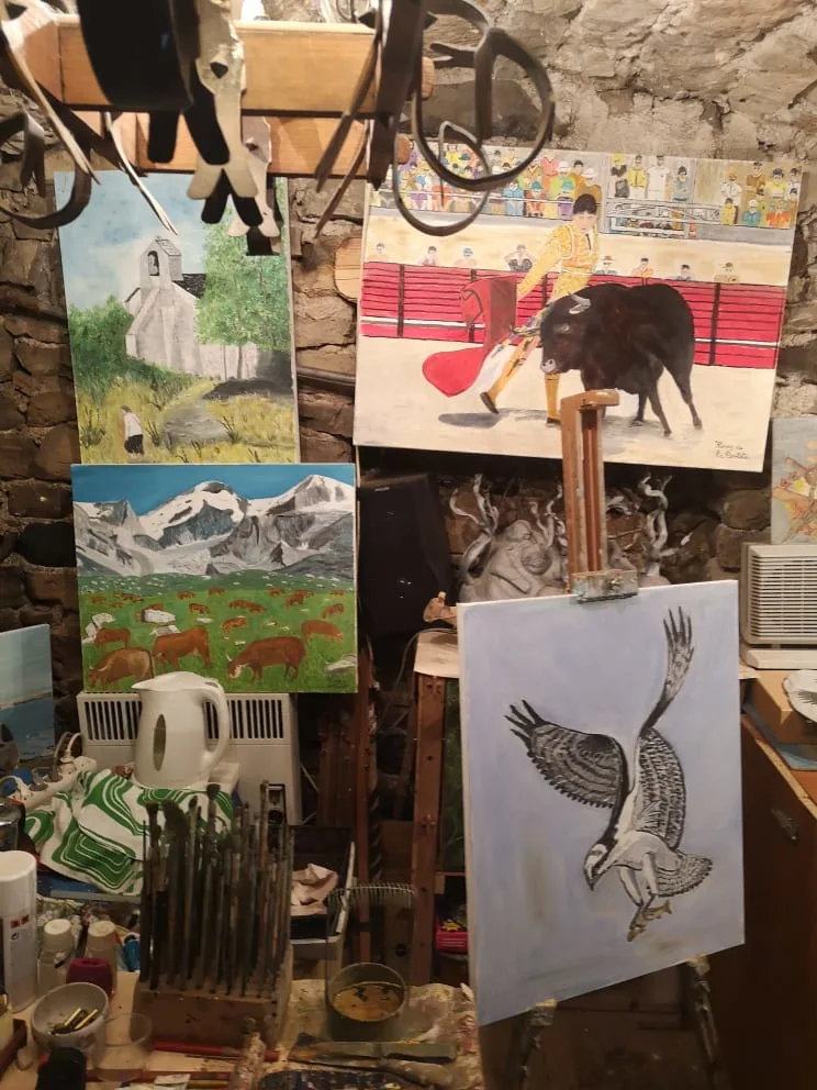 Nous passons ensuite à la visite de l'atelier dans une pièce attenante à sa maison. Henri continue de peindre encore aujourd'hui et se retrouve chaque jour dans ce petit atelier musée. Les murs sont couverts de tableaux qu'il a réalisés. Il a construit des étagères pour y déposer des statuettes et figurines qu'il a lui-même sculptées. On aperçoit également une rangée de bâtons de bergers taillés. Un portrait peint de Vincent Van Gogh est posé contre la paroi rocheuse de la pièce. Une petite maquette du « bol d'or des 7 nains » (course de nains juchés sur des ânes) retient particulièrement mon attention. Je demande à Henri si je peux lui acheter cette œuvre mais il souhaite la garder. Il me dit que je peux acheter autre chose, alors je regarde attentivement autour de moi et lui montre une autre figurine: « Ah non j'y tiens à celle-là », « Je ne pense pas vouloir m'en séparer » . Je lui désigne alors une peinture et il me dit " Allez je vous l'offre celle-ci ". Je refuse et insiste en lui disant que je désire réellement acquérir une œuvre alors il me demande de choisir une 2e peinture. J'en choisis une autre mais Henri souhaite me l'offrir également. Apparemment tout dépend des gens qui viennent lui rendre visite : si certaines personnes ne lui plaisent pas alors il ne vend pas ou n'offre pas. En revanche s'il vous a en sympathie, il est difficile de lui acheter quelque chose et souhaite vous offrir les œuvres dont il consent à se séparer.