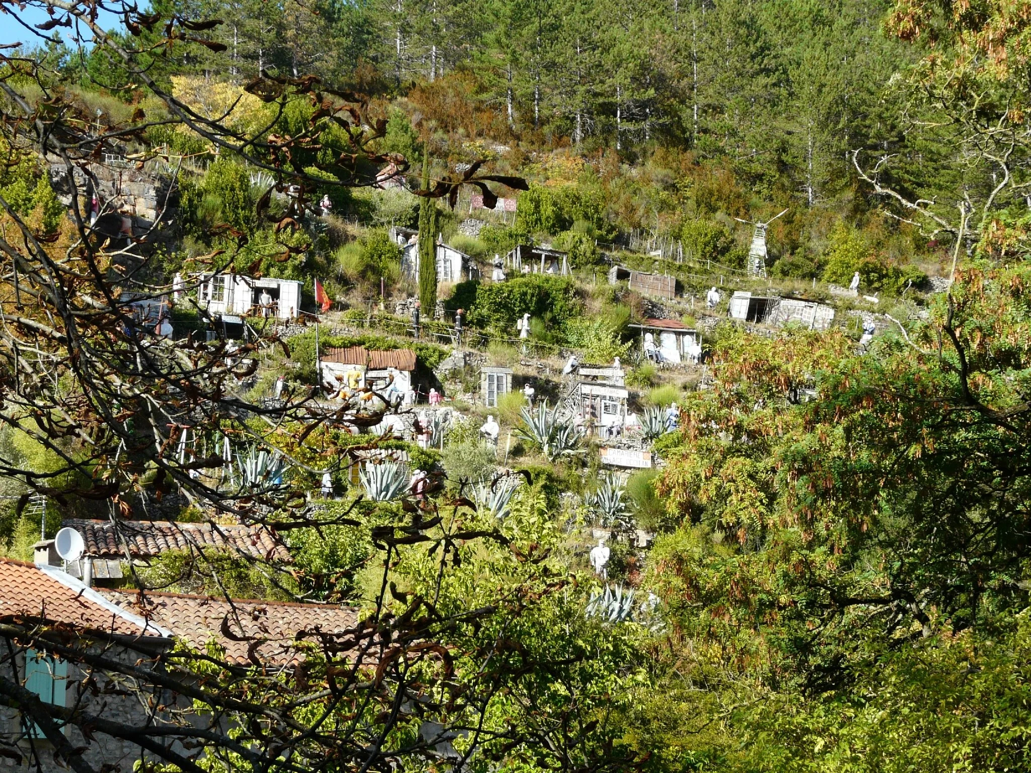 J'ai rencontré Henri Galtier à l'été 2021. Il habite à Lunas, un très beau village dans l'Hérault. Juste derrière sa maisonnette, intriquée dans un quartier aux ruelles moyenâgeuses, nous y apercevons des façades de commerces ainsi que des mannequins installés sur un coteau dont il est propriétaire. Henri Galtier ne souhaite pas me faire voir de plus près sa bourgade miniature car il aimerait lui donner un coup de jeune avant de reprendre les visites. Il ne compte pas pour autant la laisser à l'état d'abandon. Il espérait pouvoir la restaurer cette année. Les figurines grandeur nature évoluent sur un flanc de colline et illustrent divers corps de métier. Elles sont mises en situation dans leur environnement: serveurs, gendarme, lavandières, boulangers, apiculteur, médecin, pompiers, épiciers....Une quarantaine de personnages à taille réelle ont été figés dans leur mouvement. La liste est longue car c'est tout un village qui est ici représenté, le village occitan de Camarière, comme l'indique un panneau. Quel est ce village? S'agit-il d'un village imaginaire? Henri Galtier a quitté son village natal pour gagner sa vie et exercer divers métiers. Il a été mineur dans le nord de la France notamment. C'est au moment de prendre sa retraite qu'il a décidé de retourner vivre à Lunas. Le souvenir de ce village qu'il retrouve 40 ans après a toujours été vivace. C'est en rentrant au pays qu'il décide de raviver ce joyeux souvenir.