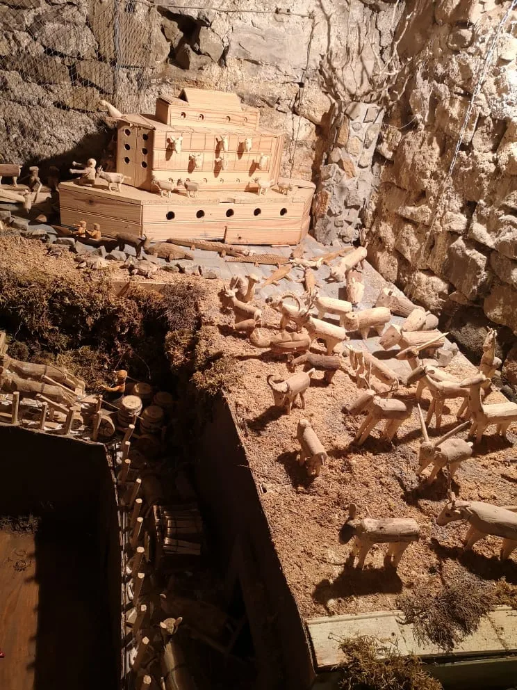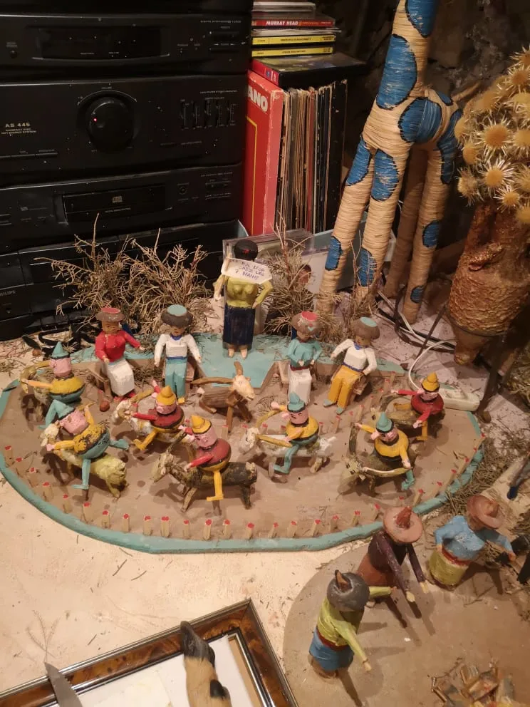 Henri m'a finalement assez peu parlé de son village de Camarière, en revanche il a tenu à me faire découvrir sa crèche ainsi que son atelier de peinture. La crèche se trouve dans une petite salle sombre sans fenêtre en face de l'entrée de la maison. En entrant dans cette pièce (qui s'apparente davantage à une grotte encastrée), Henri m'explique qu'il est croyant et qu'il a souhaité illustrer sa propre vision du mystère de la naissance de Jésus. On entre dans la pénombre, Henri branche une prise et là tout s'illumine. Des centaines de personnages, d'animaux évoluent dans un village miniature. la crèche ne se réduit pas à la représentation d'une arche et à son iconographie traditionnelle. On y découvre tout un microcosme de personnages insérés dans un environnement rural: Moulins à vents, attelages divers, calèches, paysans, petits ponts de pierre. Le décor occupe toute la pièce. Une arche de Noé peuplée de nombreux petits animaux taillés dans le bois s'insère également dans le décor. Henri Galtier a tout sculpté et façonné. Les seuls matériaux récupérés sont quelques cailloux (pour les rochers), des pommes de pin pour les arbres et de la végétation. Tout va très vite au cours de la visite...il ne tient pas à s'attarder sur la description de ces réalisations. Il répond de manière assez laconique lorsque je lui pose des questions. Il est à la fois amusé et content de pouvoir faire visiter sa crèche et son atelier mais ne ressent pas l'envie de développer davantage.