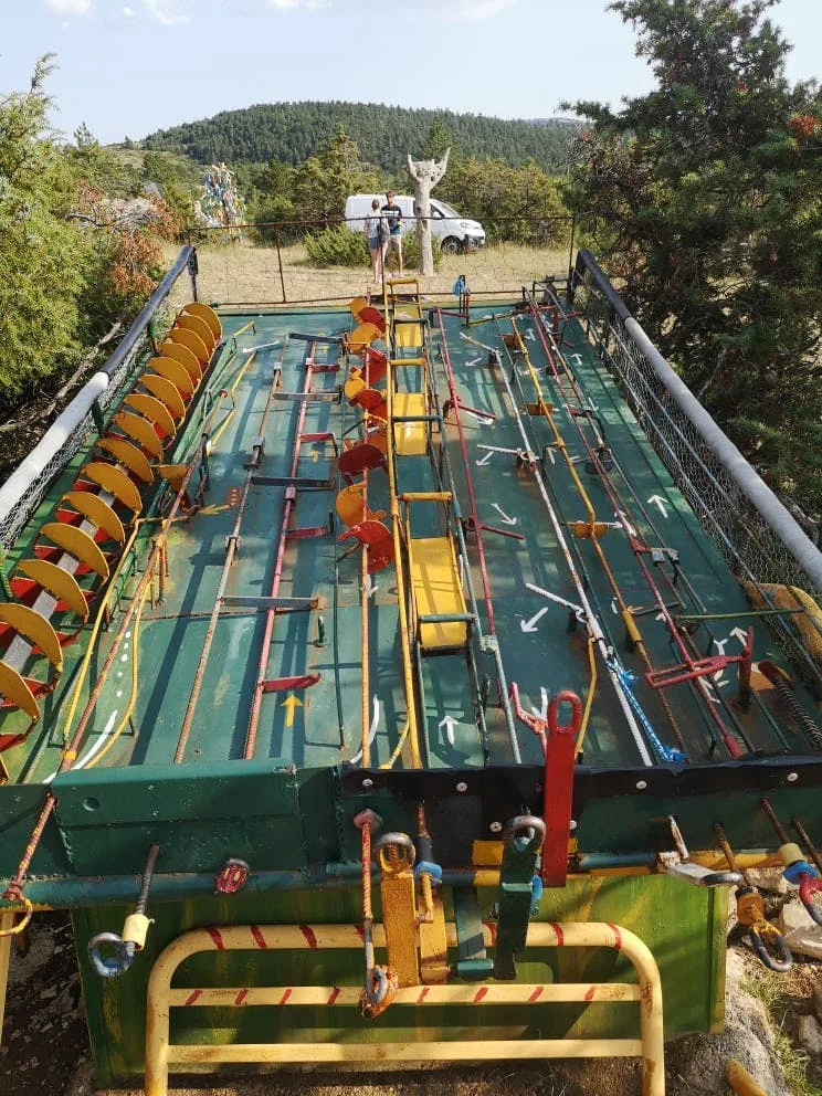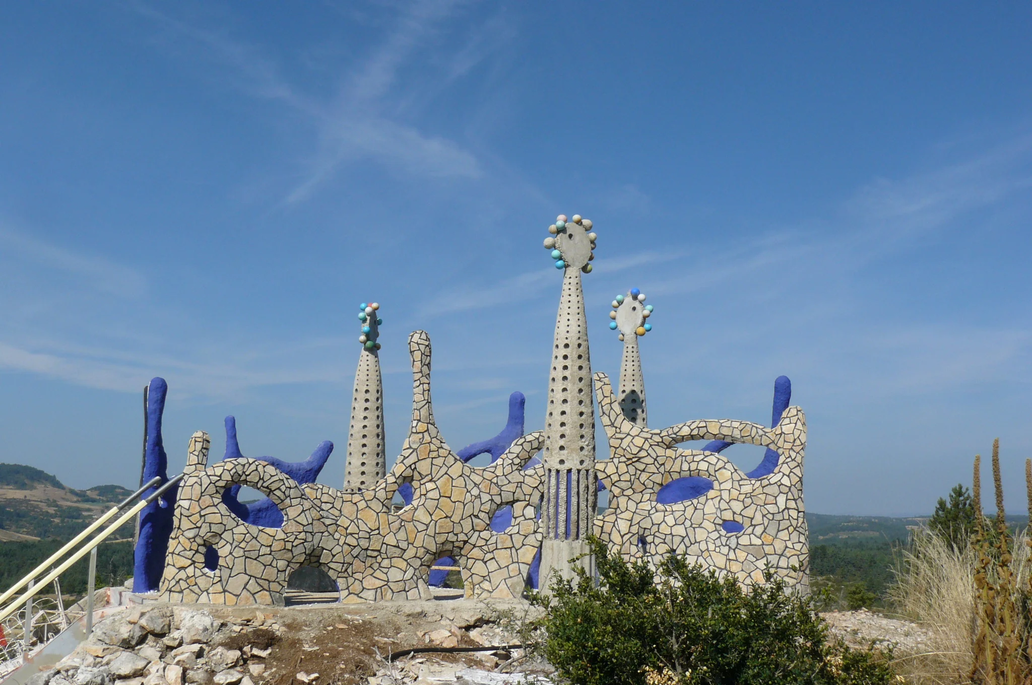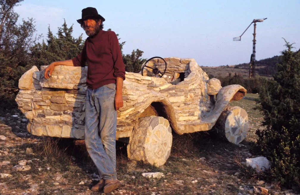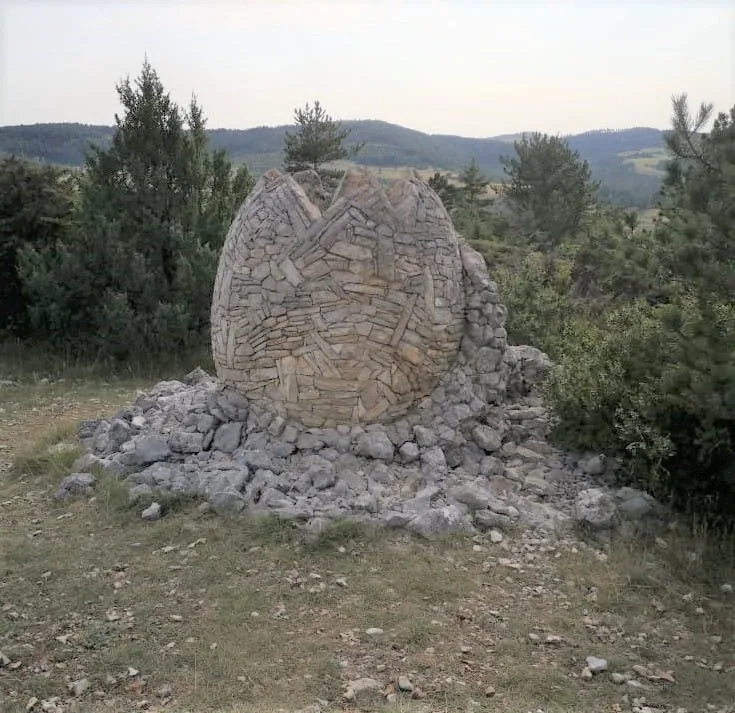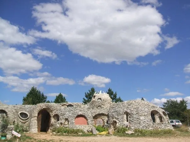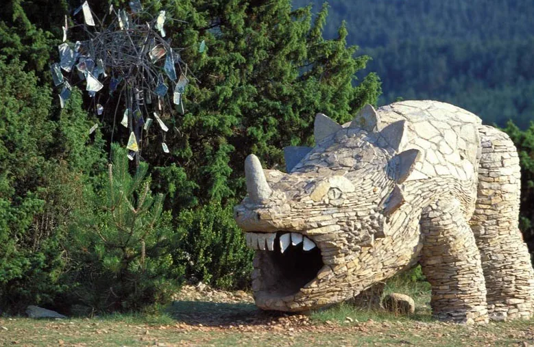 Non loin de ces installations mécaniques ludiques, on découvre des sculptures parées de pierres locales (prélevées sur les collines voisines) qui semblent avoir été excavées d'un site préhistorique. On tombe sur un œuf préhistorique géant, une voiture datant de l'âge de Pierre, un rhinocéros antédiluvien, une moto fossilisée.. Plus loin s'érige un monument qui n'est pas sans rappeler l'artiste Gaudi et les ondulations architecturales du parc Güell. Il s'agit d'un belvédère depuis lequel nous pouvons contempler la nature qui s'étend à perte de vue. Le vent s'engouffre dans la vallée et le bruit évoque celui des vagues...Ce lieu a sa propre vie et le temps s'arrête lorsque nous le pénétrons.