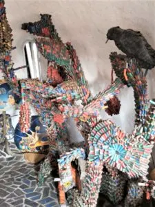 On se promène dans ce jardin pittoresque, jalonné de plusieurs fabriques, un château, une maison champignon, un bus décoré. J'ai préféré commencer par la visite du jardin pour ensuite entrer dans la fraîcheur de la maison igloo. On a l'impression d'entrer dans le corps d'une bête monstrueuse. Les façades de la maison nous dévisagent, un œil en pierre nous scrute avant même que nous pénétrions à l'intérieur. On a peur de réveiller la bête et on entre dans un silence solennel. Des pièces sinueuses s'offrent à nous, c'est à la fois un petit musée et un lieu de vie avec une salle de bain, une cuisine...Les tableaux de Jo tapissent les murs de la pièce principale. Les arabesques et les courbes structurent également l'intérieur de l'habitat. Les parements en mosaïque du foyer remplacent les appareillages de pierre à l'extérieur. On y contemple une grande sculpture, allégorie du corbeau et du renard faite à partir d'un assemblage de cartouches de fusils. A côté de cette imposante réalisation, un petit ensemble de peintures représentant des célébrités rappelle les compositions énigmatiques de Salvador Dali, comme ce Cyrano de Parano que j'ai pris en photo. La fraîcheur de l'espace intérieur me fait du bien, je commande un rafraichissement auprès de Dominique la femme de Jo et prends le temps de m'assoir et d'admirer tous les artefacts qui m'entourent...Il y a tant de choses à voir, tant de peintures , de sculptures, de mots, d'annotations et de réflexions sur le monde que Joe cherche à faire partager.