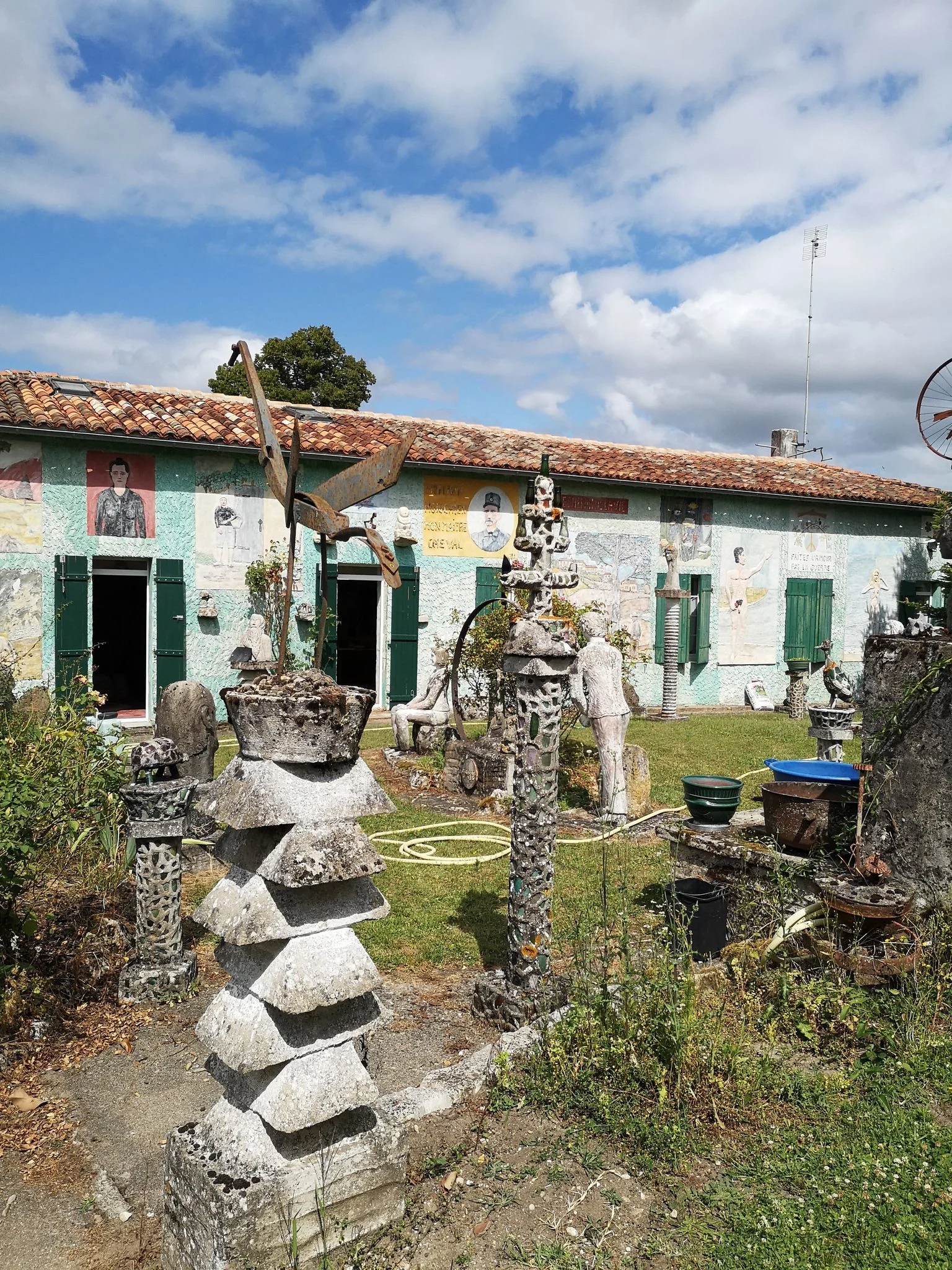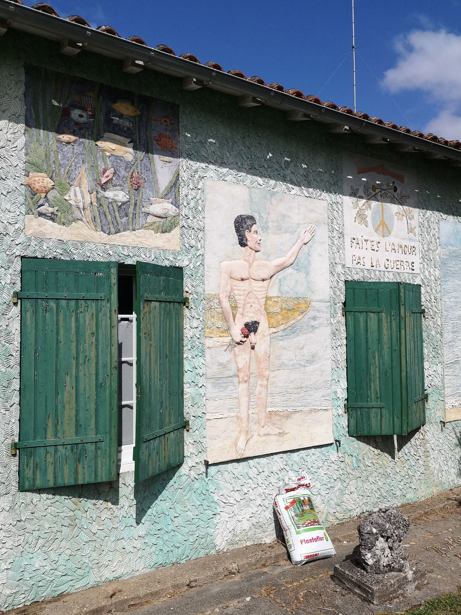 Libertaire dans l'âme, Lucien Favreau se piquait d'iconographie frivole; on pouvait tout à la fois admirer un Jésus déguisé en bonne femme, une vache qui pisse (en ouvrant une vanne dissimulée), une Eve à la pose suggestive ou encore une jeune fille dévoilant son postérieur. Un explicite : « Je suis seul ce soir » apparait sur la façade avant de sa maison.
