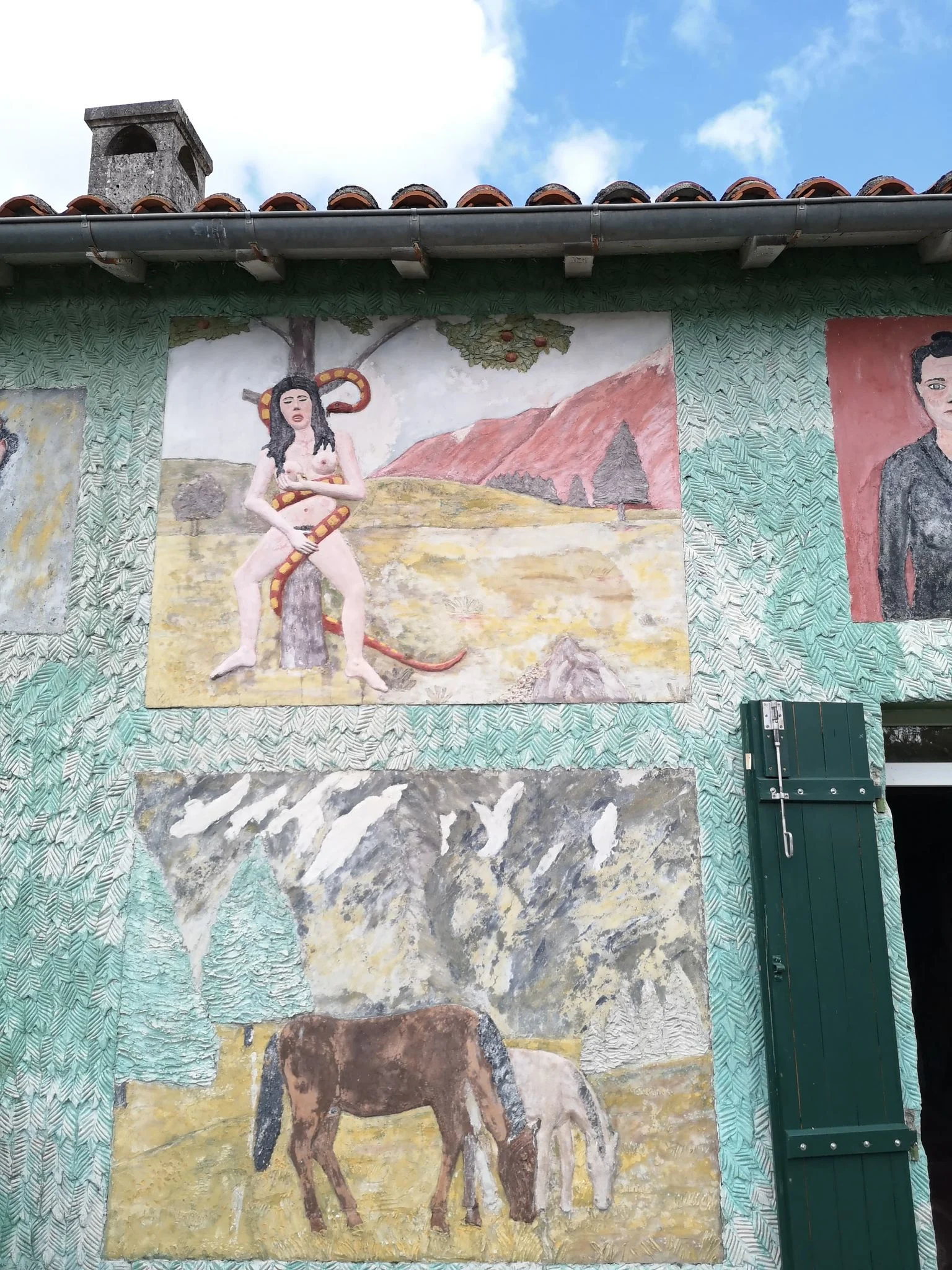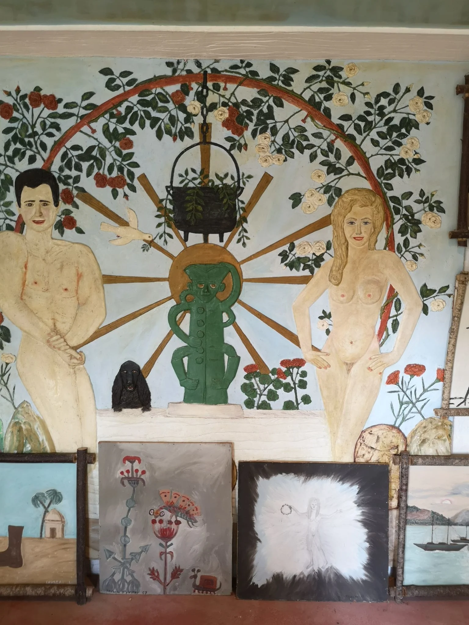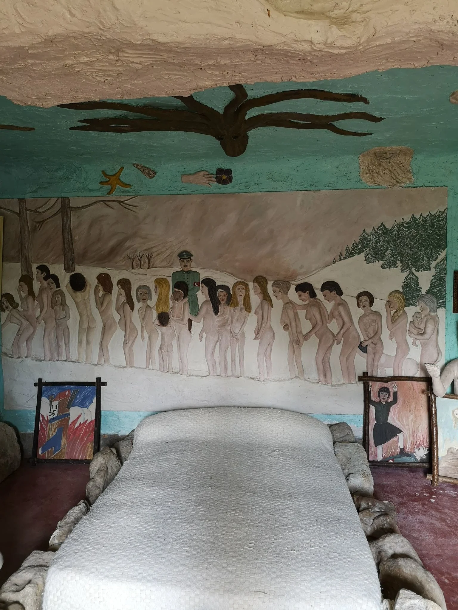 On s'étonne à la vue d'une fresque des plus singulières au-dessus du lit de sa chambre: une procession de femmes nues, en proie au joug d'un dignitaire nazi, avançant péniblement dans la neige en direction de l'échafaud. Eros et thanatos, érotisme et fascination pour la mort, se conjuguent dans cette peinture murale hallucinée. Le monde apparaît alors comme une pulsation rythmée de vie créative et de mort destructrice. Une Eve dénudée et tentatrice est exposée à gauche de cet ensemble peint.