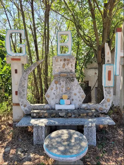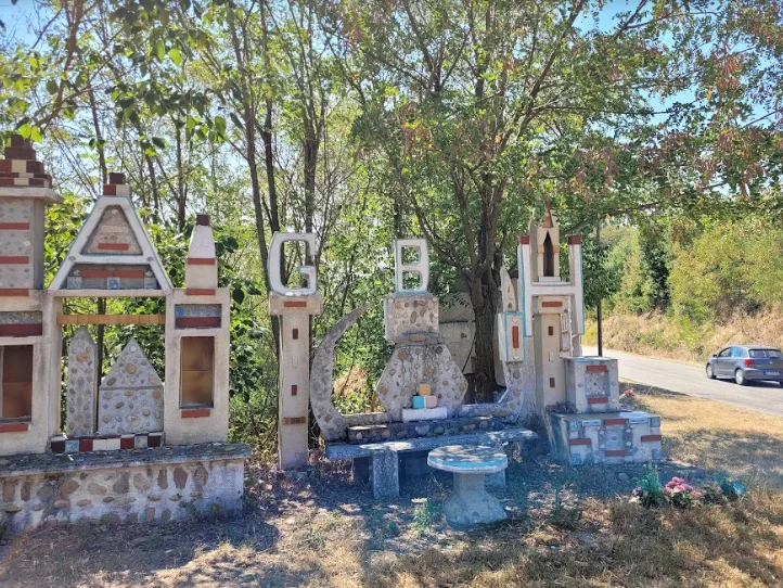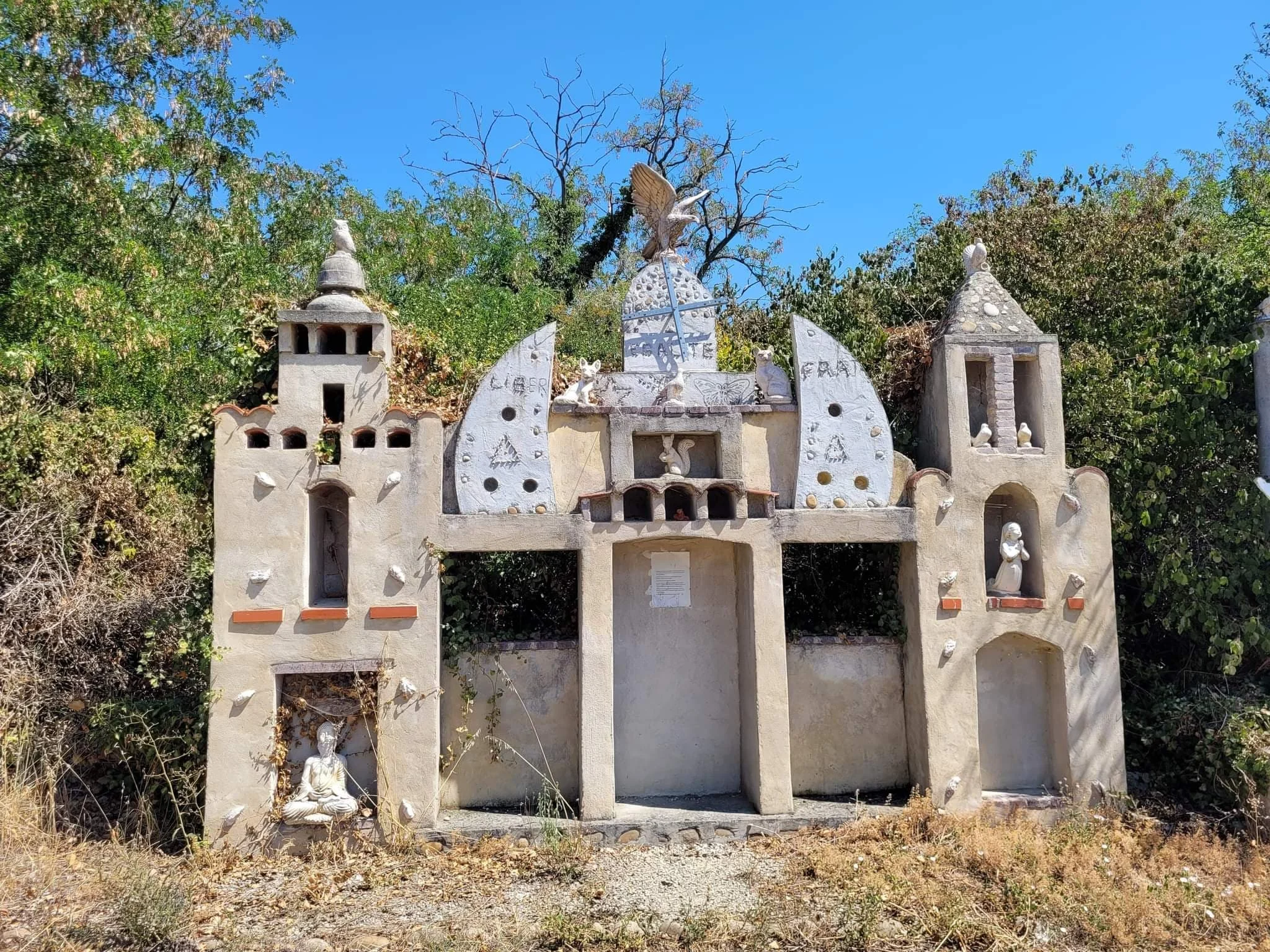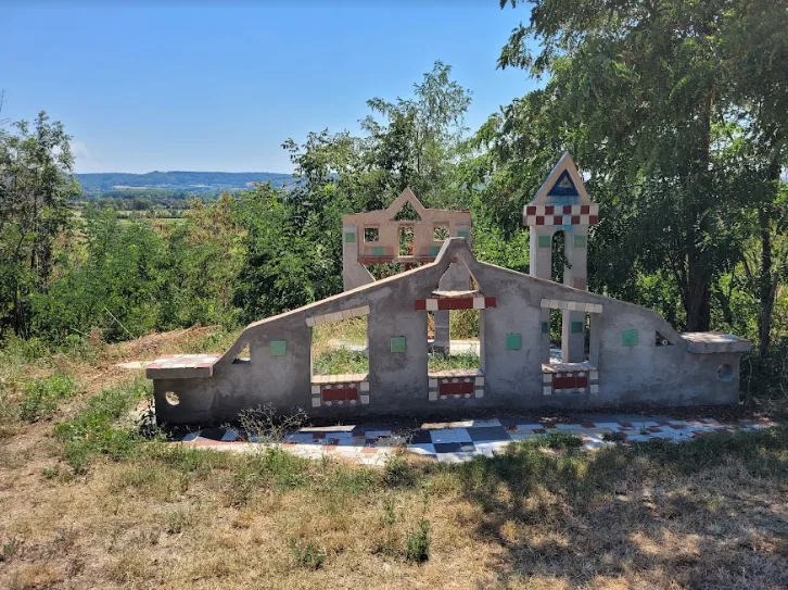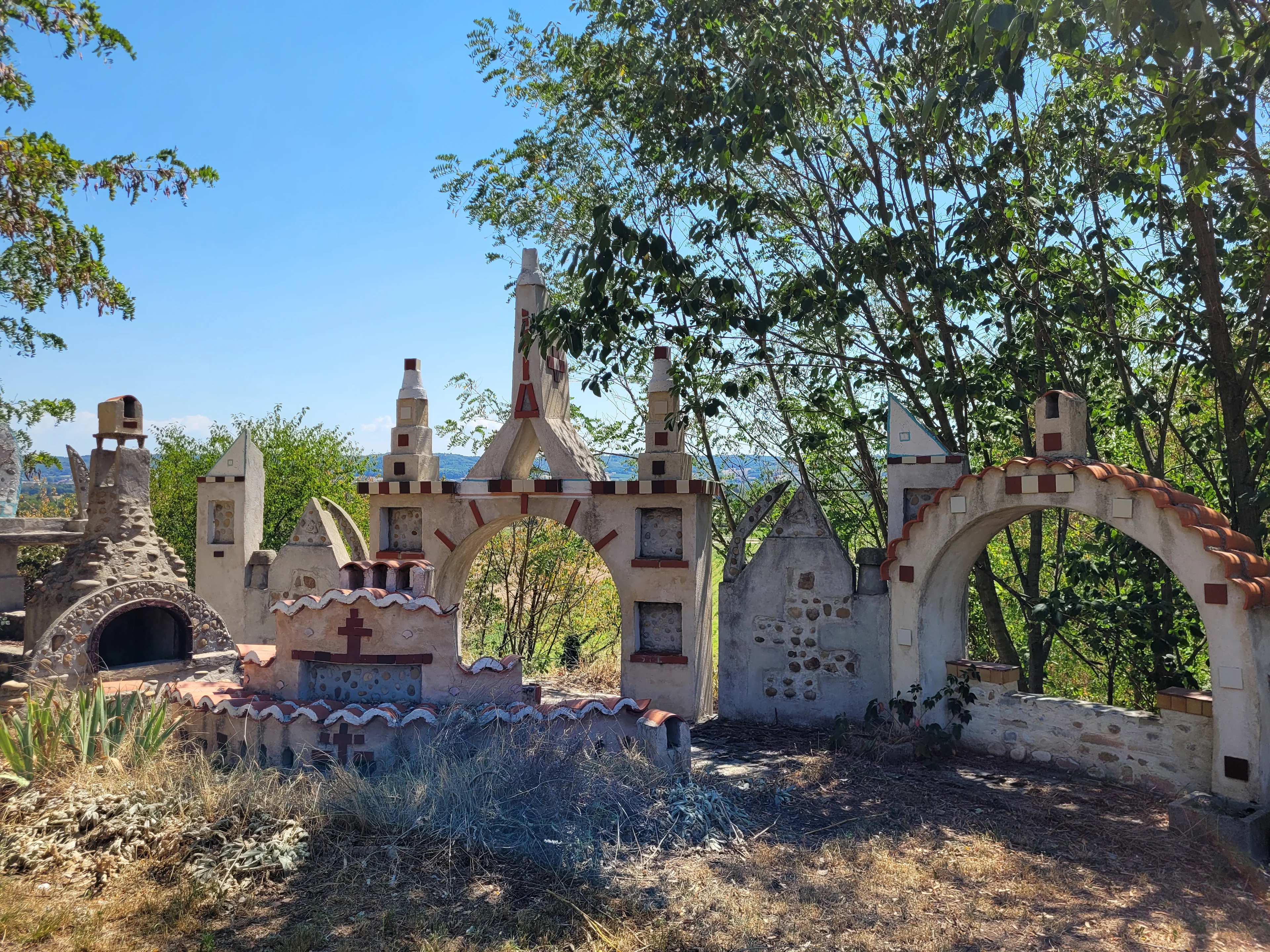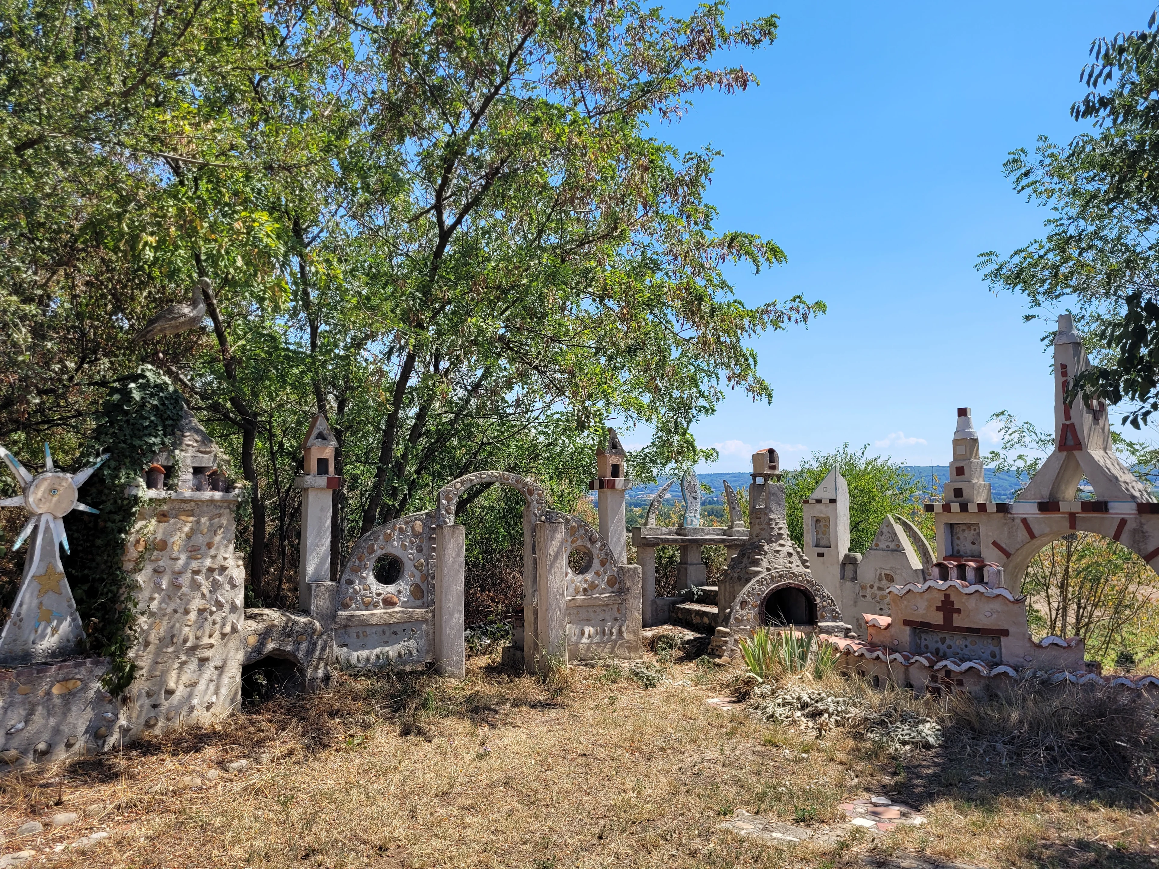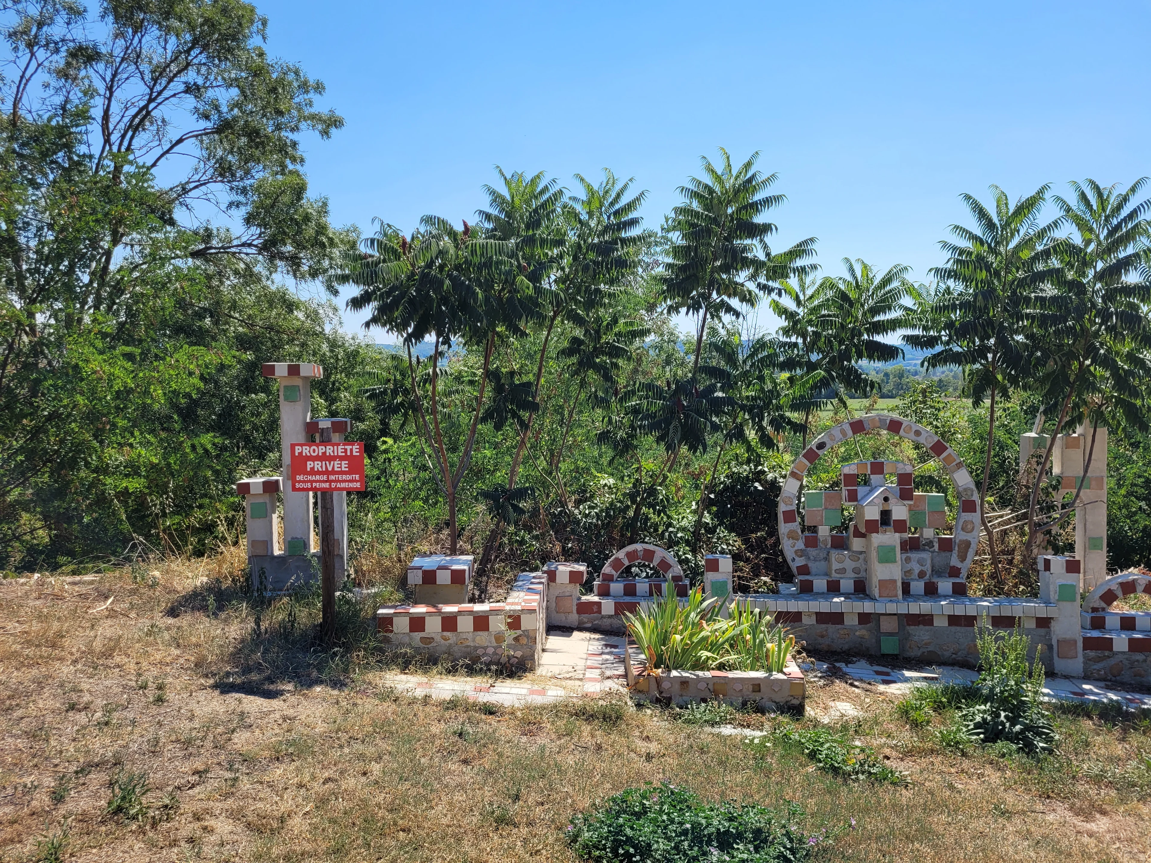 André Muetton - Visite en août 2022 Il y a des fantasmes qui se réalisent, il y a des trésors qui se déterrent... Par le plus fortuit des hasards, alors que je sillonnais les routes de campagne en voiture en direction du Palais idéal du facteur Cheval, je découvrais l'environnement d'André Muetton. Les yeux m'en tombaient car je sentais que je découvrais un site totalement inédit. Il n'était pas indiqué sur la carte de France que j'avais criblée de petits points, désignant tous les environnements d'art singulier que j'avais répertoriés. Cette carte, qui accompagne mes pérégrinations dans l'hexagone, est le fruit de recherches sur plusieurs années, en parcourant internet et les ouvrages bibliographiques concernés, et a pour but d'inventorier les diverses productions de ces habitants paysagistes. Aucun signe, aucun marquage n'apparaissait à cet endroit précis de la carte. Je marquais alors d'un point rouge irrévocable la commune de Lapeyrouse Mornay sur mon plan.