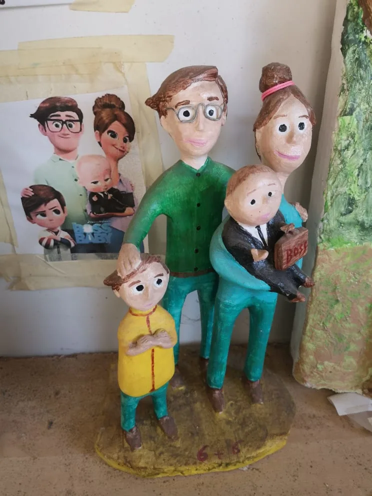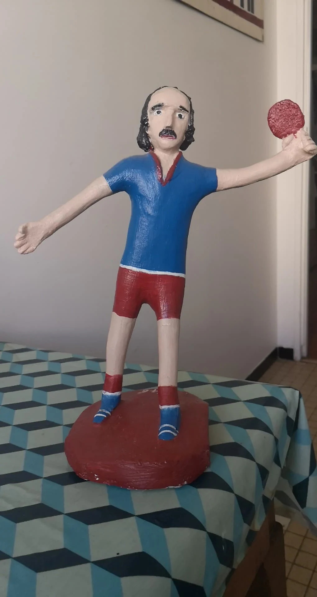 Je n'ai pas su résister au désir d'acquérir une de ses sculptures. Cette pulsion, systémiquement installée par le consumérisme, s'est manifestée dans toute son outrecuidance lorsque je suis tombée devant mon idole de jeunesse: Jacques Secrétin. J'adorais son spectacle humoristique, le Show Secrétin-Purkart, une démonstration rocambolesque entre deux champions du ping pong français, à la frontière du sport et du spectacle donnant à voir des échanges spectaculaires et de nombreux autres gags... La sculpture achevée, je retournai au Pas Français pour la récupérer et eus droit à une autre visite guidée, à la vitesse d'élocution stratosphérique. Merci Vivi pour Jacques! Il se porte bien et t'envoie le bonjour comme tu peux le constater sur la photo. Jacques Secrétin nous quitta le 24 novembre 2020. Cette idole commémorative trône désormais dans mon salon, et aucun jour ne passe sans que je ne fonde devant ce regard de chien battu.