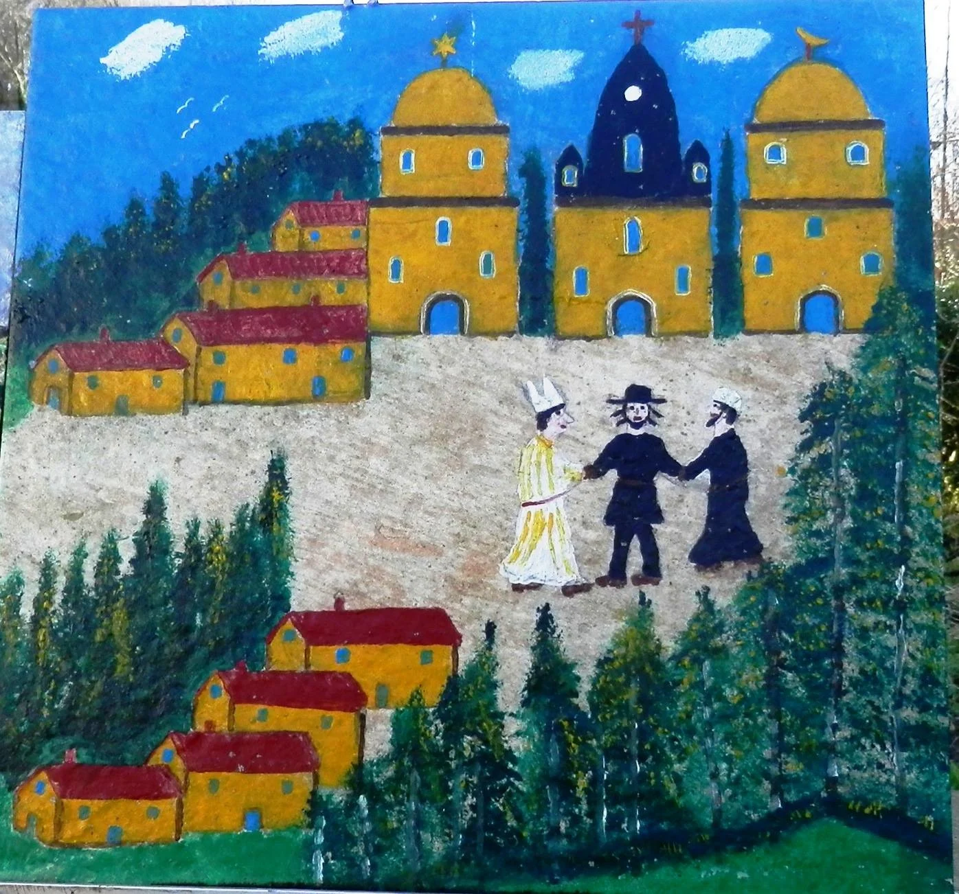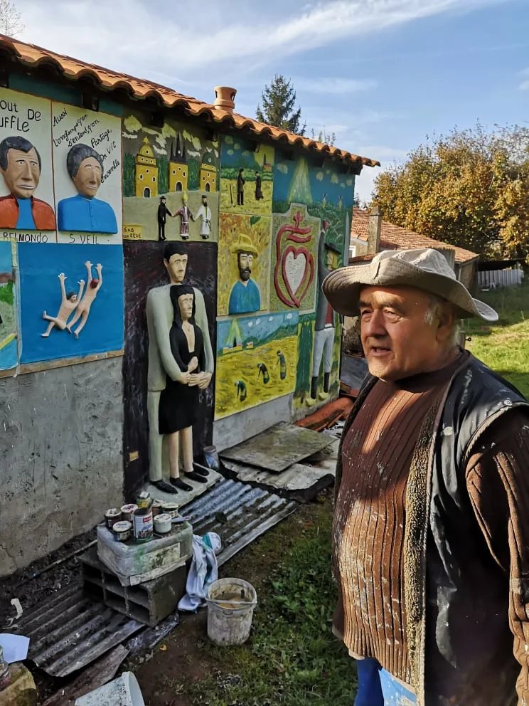 Je rencontrai pour la toute première fois un créateur en plein ouvrage. A mon arrivée sur les lieux, Vivi Fortin peignait une fresque en méplat (bas-relief aux surfaces principalement planes et peu modelées) sur le mur d'un abri de jardin. Je m'en voulais de l'interrompre en pleine activité mais l'enthousiasme avec lequel il accueillit ma venue me conforta. Il me décrivit, avec un débit ininterrompu, ses dernières réalisations: « Tu vois sur ce mur il a représenté Brigitte Bardot à la Madrague, Marcel Cerdan et Edith Piaf, les trois religions qui s'unissent, un cœur vendéen (...) Est ce qu'il a d'la gueule? Tu vas être surprise car il parle de tout".
