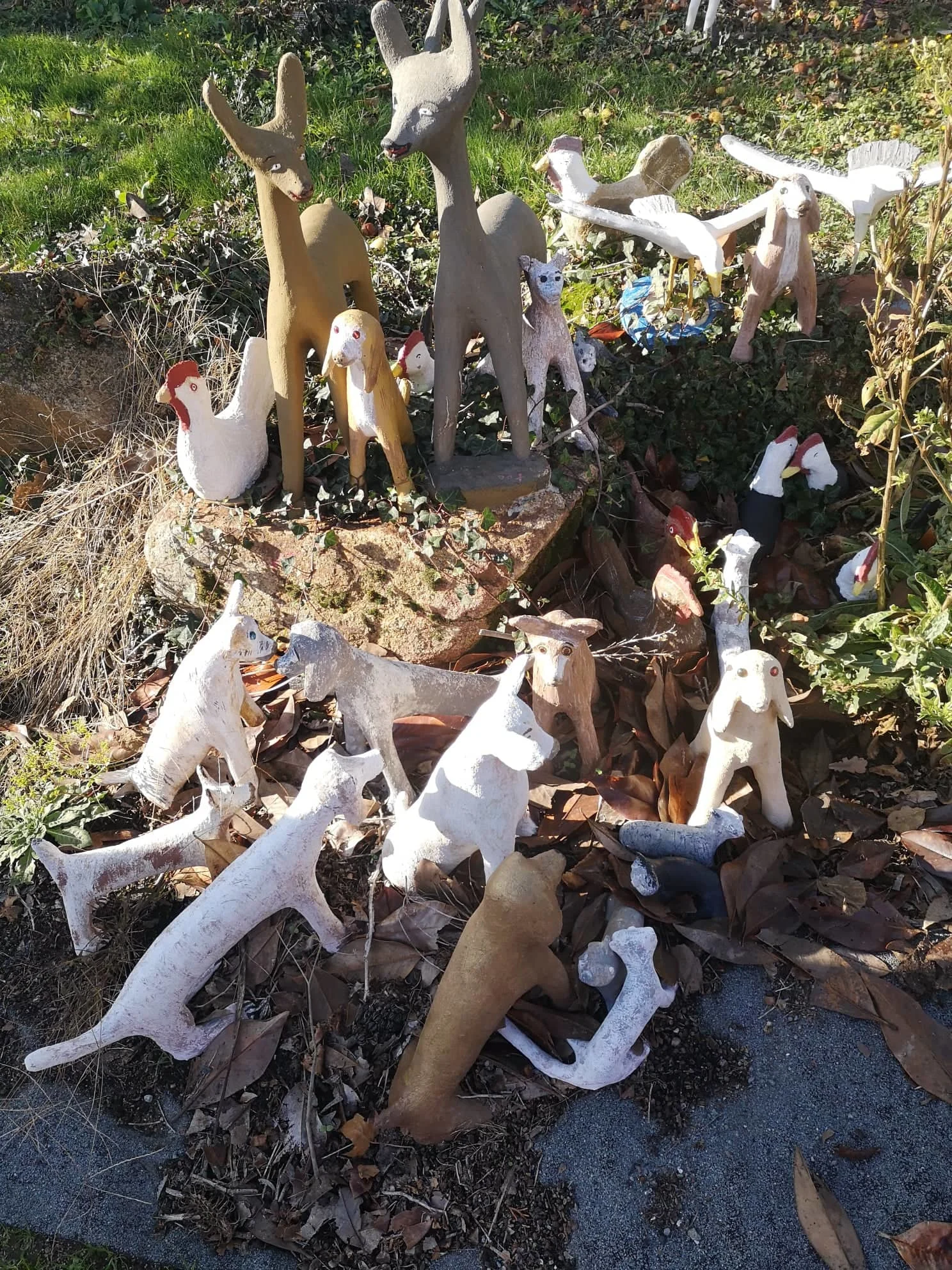 La visite guidée commence par les œuvres exposées dans le jardin. Vivi nous montre ses premières réalisations en ciment : un joyeux bestiaire (coqs, poules, biches, chiens, chats, oiseaux) batifole dans l'herbe. Les animaux cohabitent harmonieusement en dépit de leurs différences. On retrouve là un thème cher à son créateur qui s'érige en porteur de messages de paix et de fraternité.