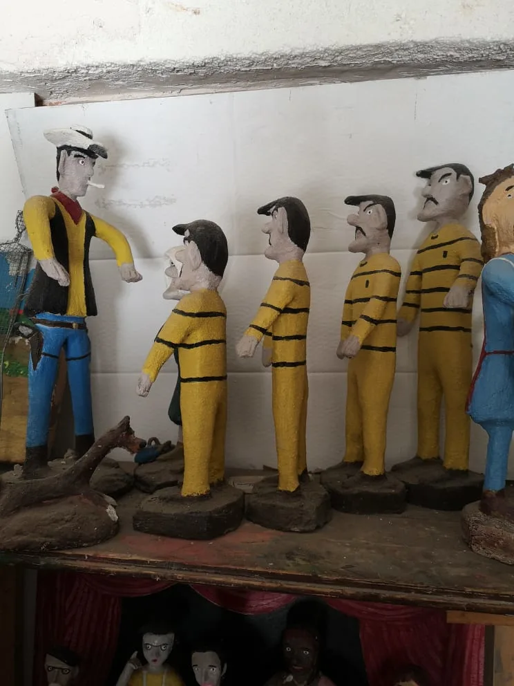 Ce n'est que lorsque Vivi décide de se remettre au travail, que je prends le temps d'admirer quelques unes de ses réalisations . Avant de poursuivre son activité créatrice, il me propose de boire un coup. Il a aménagé un petit coin de salon dans son garage et les étagères sont généreusement pourvues en alcools et boissons que les visiteurs lui offrent pour le remercier.