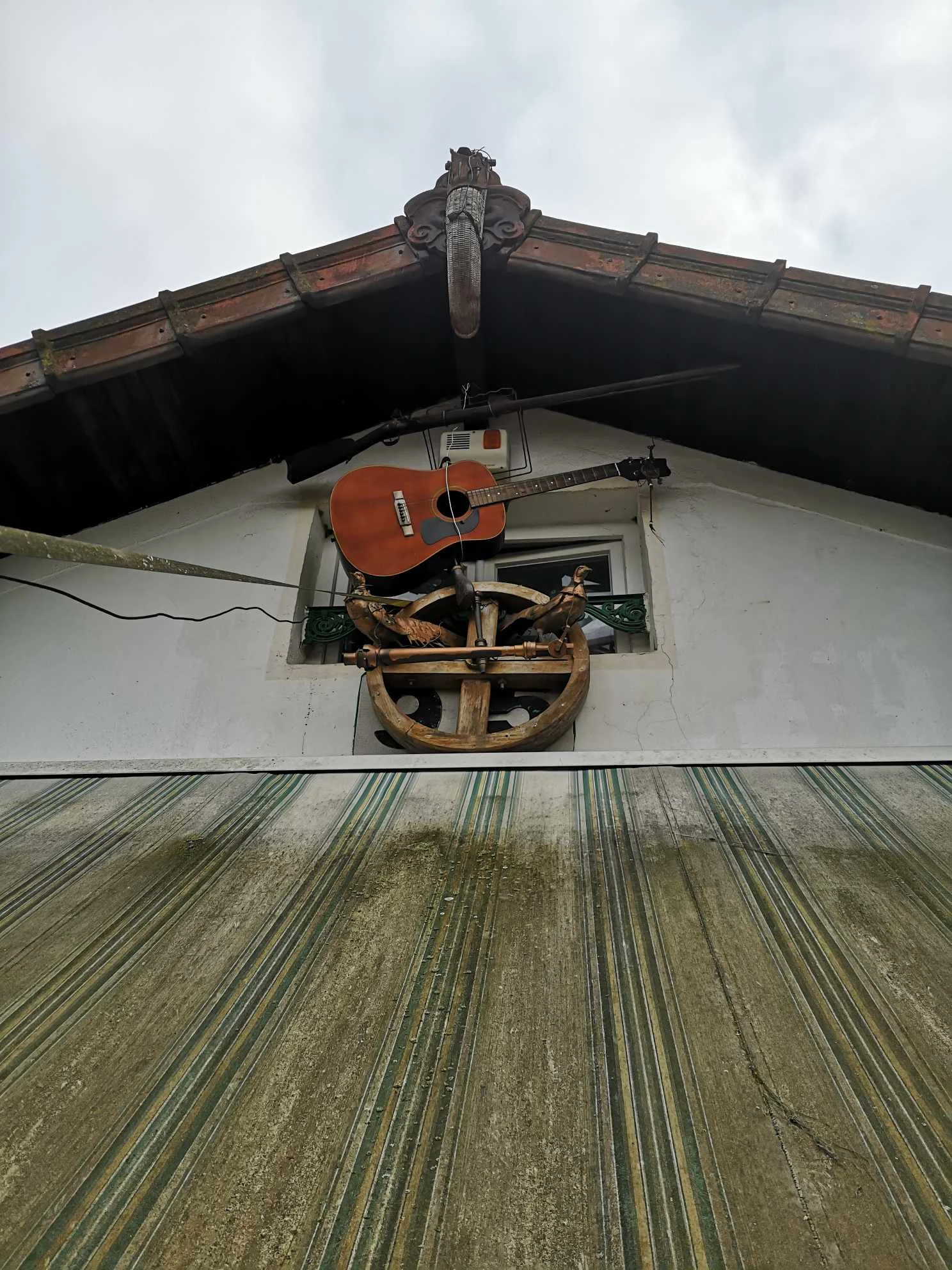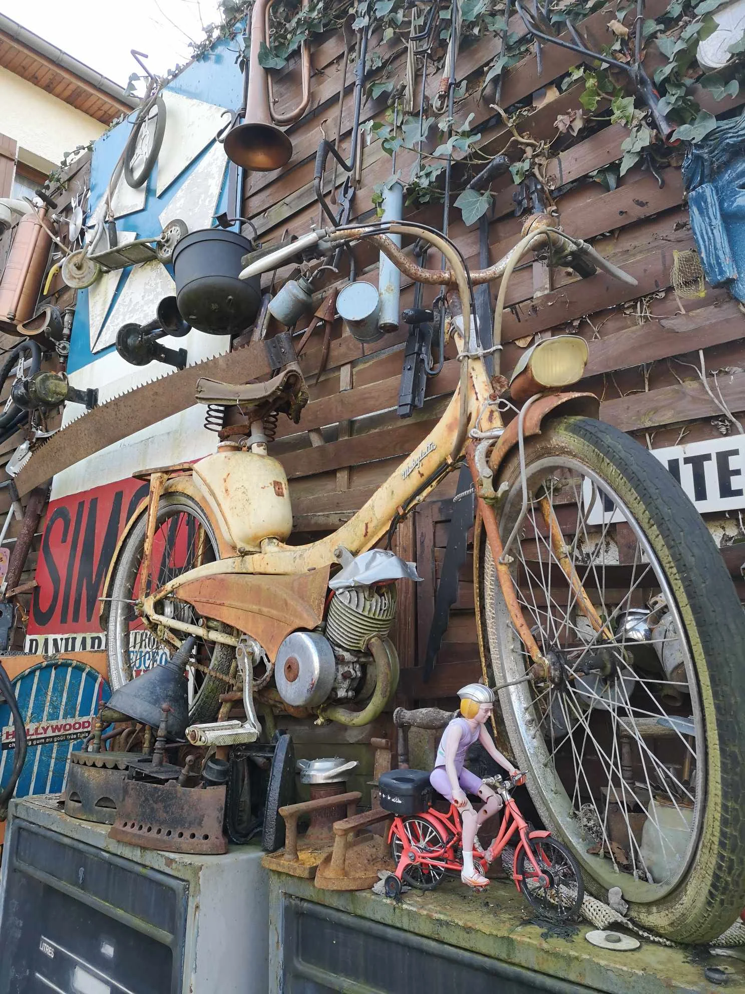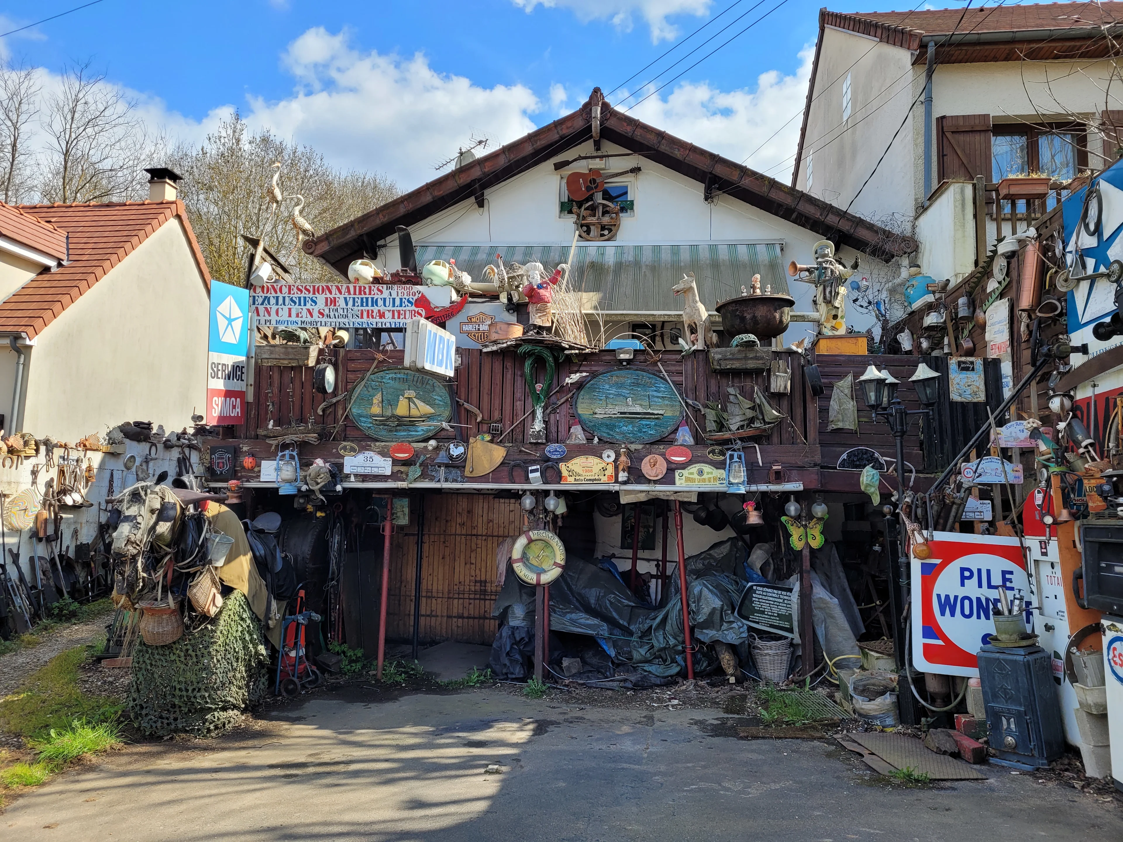 On longe par la suite un terrain végétalisé composé de plants d'oliviers et de fabriques miniatures. S'ensuit une succession de carcasses de voitures: 4L, 2CV et autres carrosseries ternies viennent trouver du repos en ces lieux. La maison, plutôt une cabane, surplombe ce mirifique talus d'épaves. Sa façade est recouverte d'artefacts en tous genres: bibelots, effigies de ciment, plaques en tôle, vieilles enseignes publicitaires, bouées ou encore des roues de bicyclette viennent rehausser la façade où trônent sous le toit un vieux fusil et une guitare, singularité proche d'une esthétique redneck.