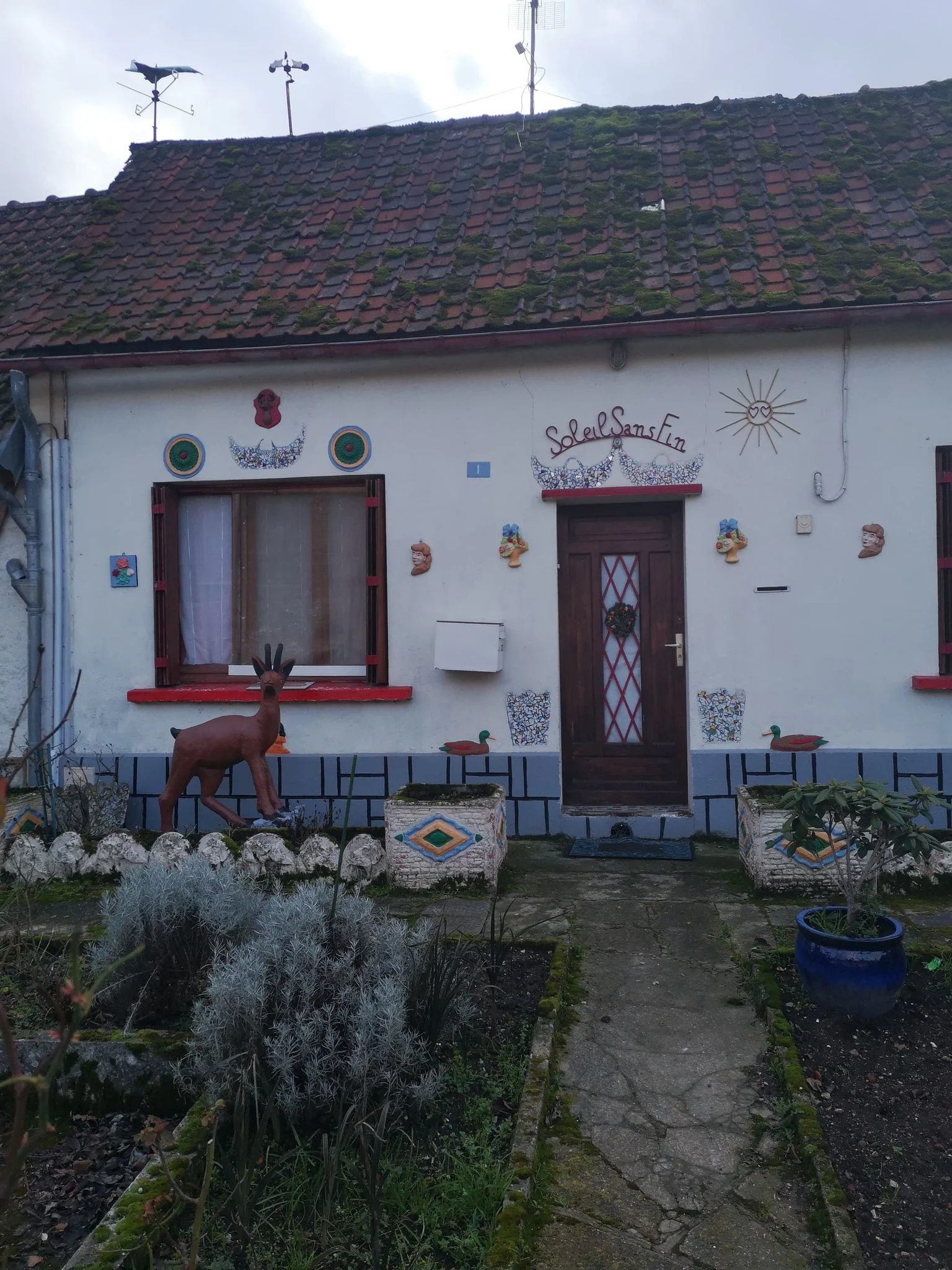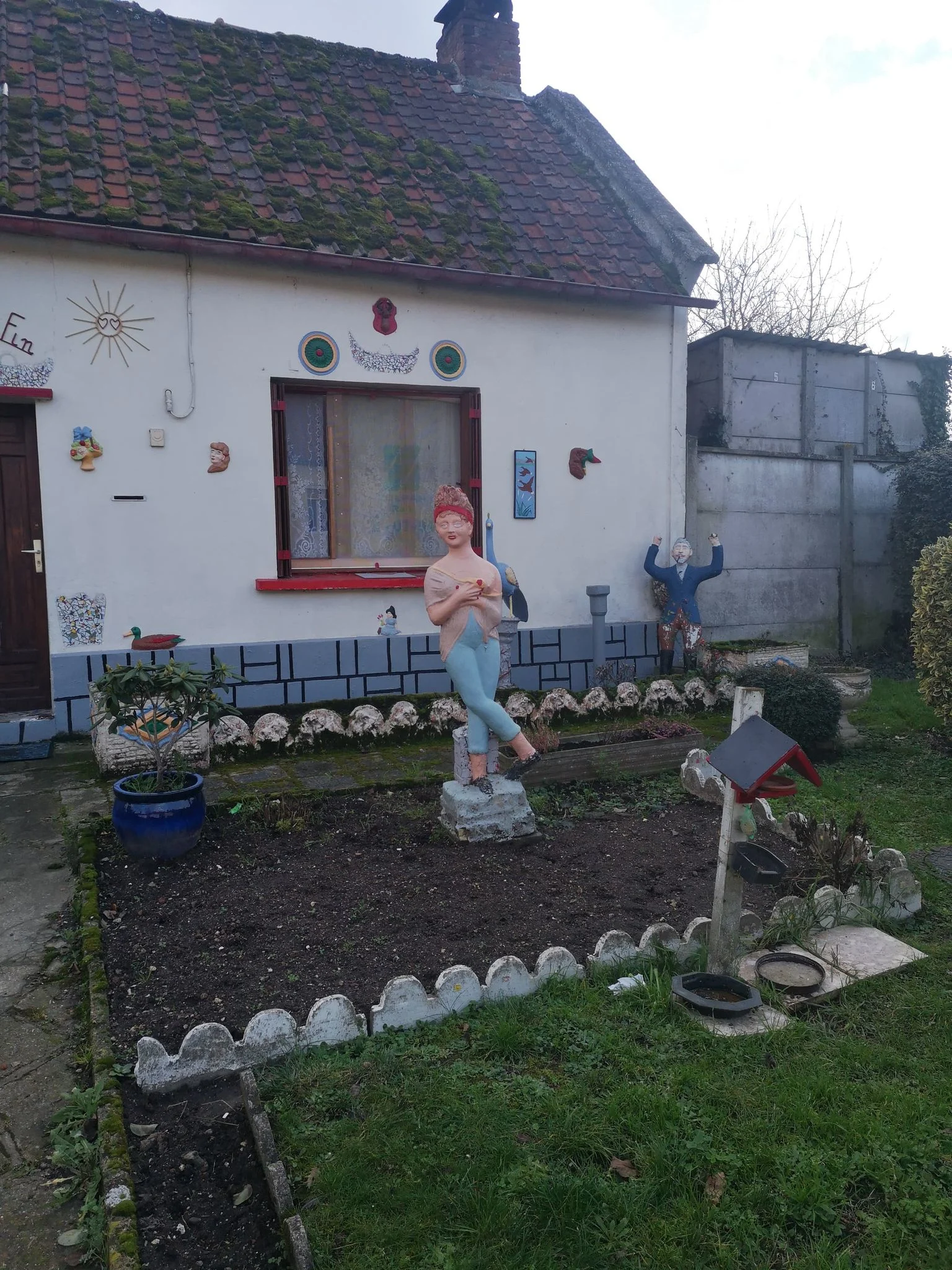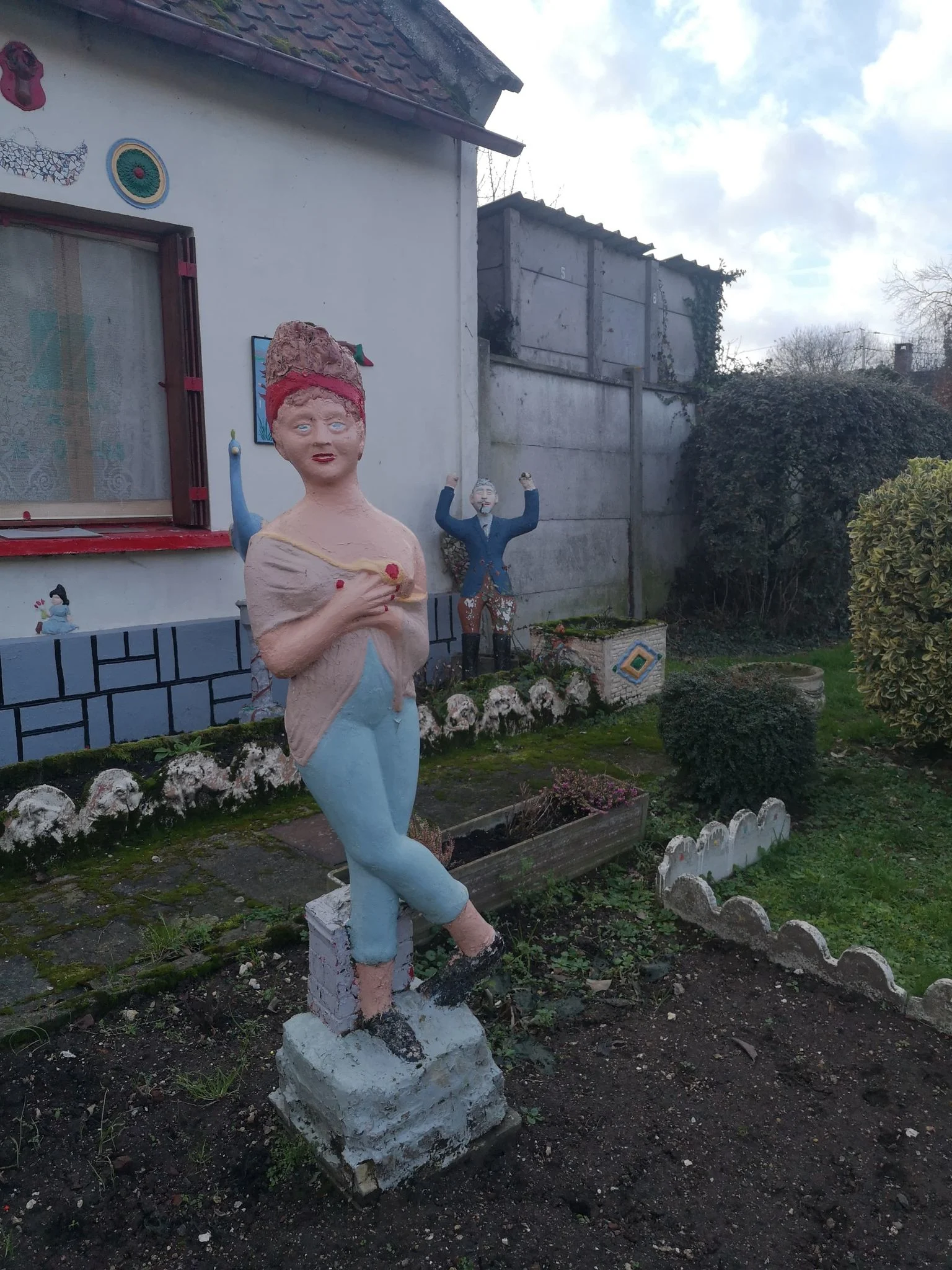 En contemplant la façade de la maison et en la comparant à la photographie prise par Bruno Montpied en 2011 et publiée dans Le Gazouillis des éléphants, je remarquai, comme dans un jeu des sept erreurs, quelques changements significatifs: une statue représentant une danseuse avait été déplacée, des éléments décoratifs manquaient à l'appel et pour finir les sculptures et divers moulages avaient été peints de couleurs différentes. Était-ce l'usure naturelle de ces artefacts qui altérait à ce point les couleurs? Dans une photographie plus ancienne prise par Francis David dans son Guide de l'art insolite du Nord/Pas-de-Calais/Picardie datant de 1984, la couleur des vêtements portés par cette danseuse était tout autre. Les fabriques miniatures ont disparu mais les sculptures sont restées intactes devant la maison.