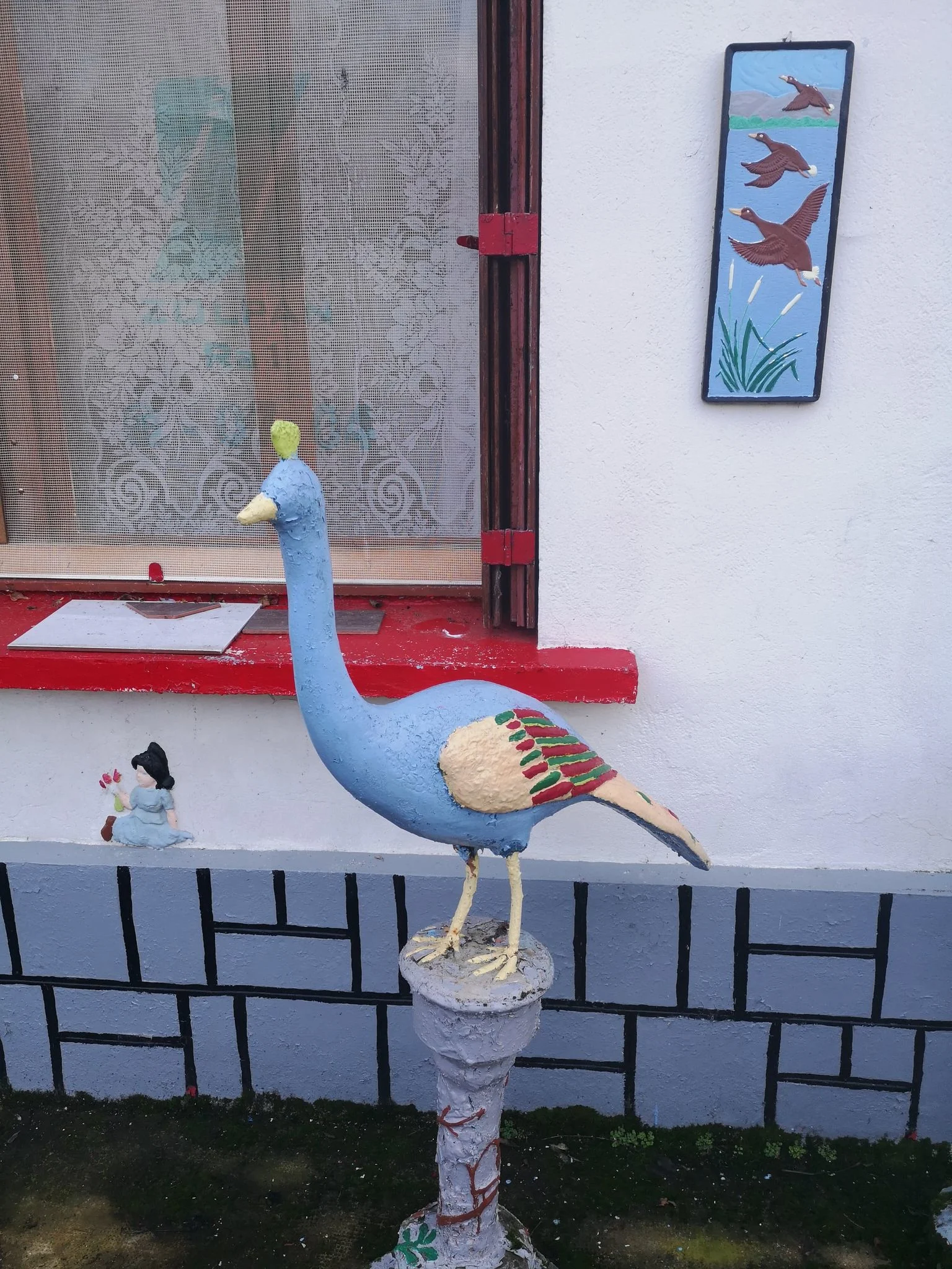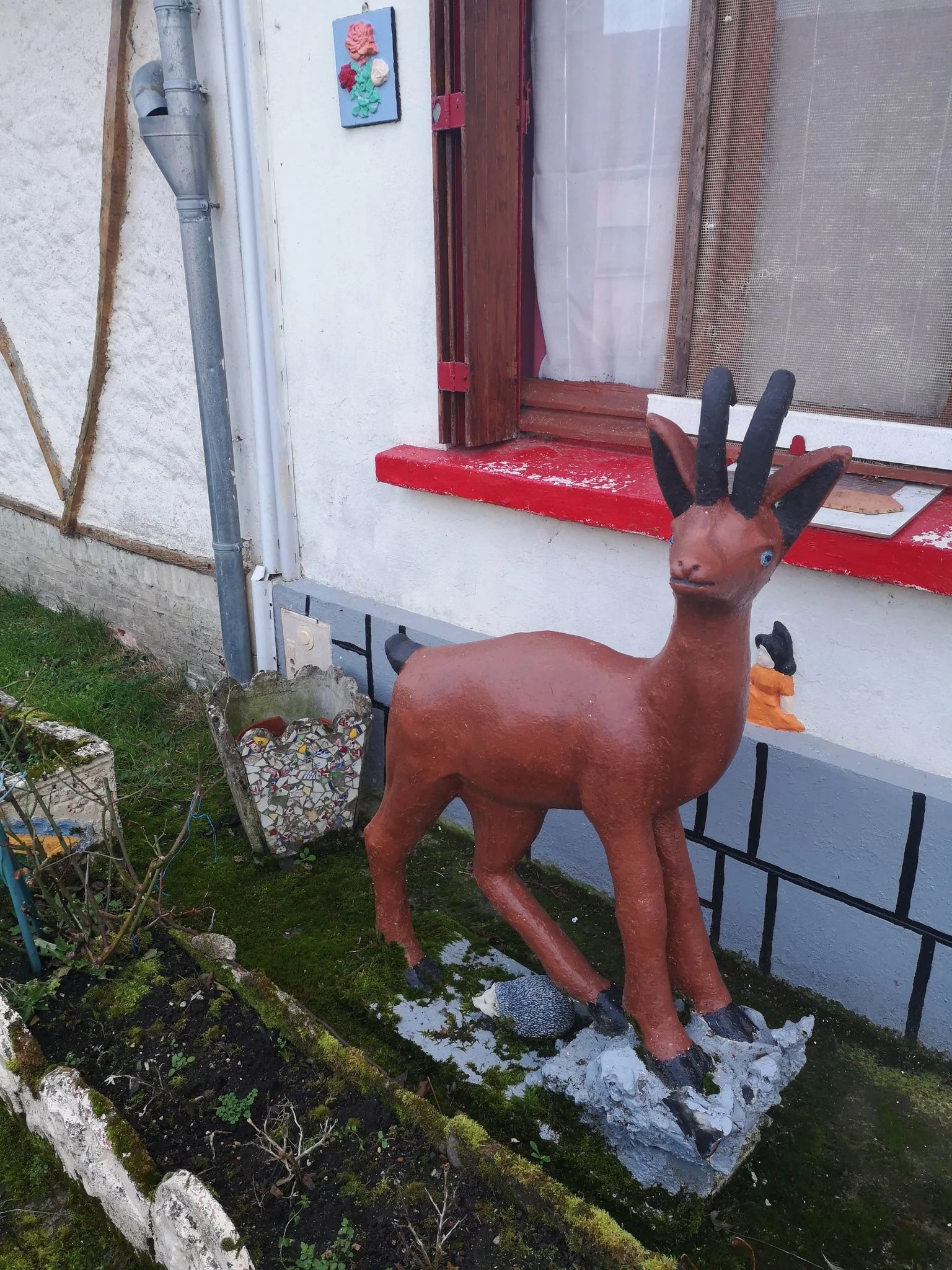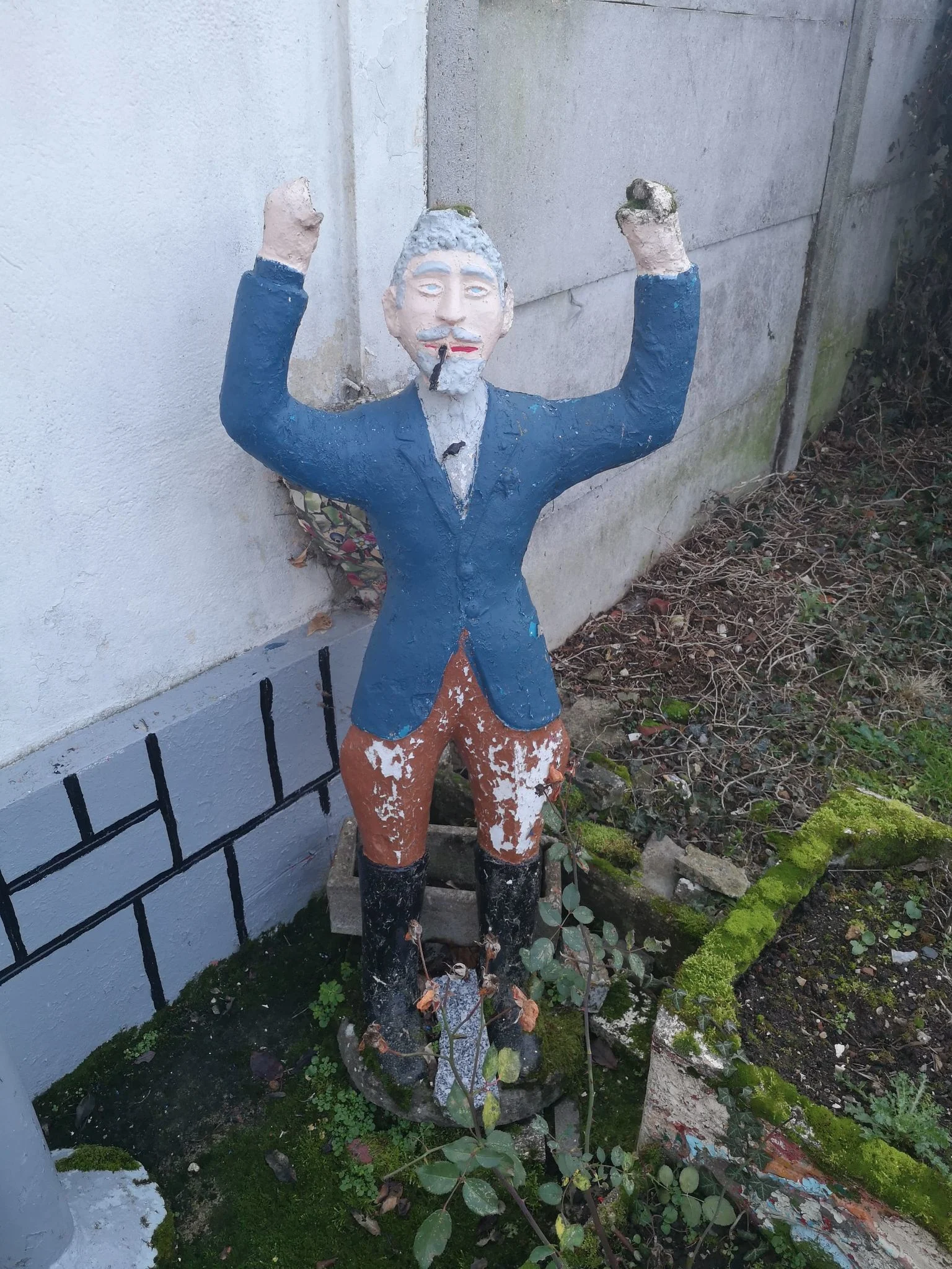 En contemplant la façade de la maison et en la comparant à la photographie prise par Bruno Montpied en 2011 et publiée dans Le Gazouillis des éléphants, je remarquai, comme dans un jeu des sept erreurs, quelques changements significatifs: une statue représentant une danseuse avait été déplacée, des éléments décoratifs manquaient à l'appel et pour finir les sculptures et divers moulages avaient été peints de couleurs différentes. Était-ce l'usure naturelle de ces artefacts qui altérait à ce point les couleurs? Dans une photographie plus ancienne prise par Francis David dans son Guide de l'art insolite du Nord/Pas-de-Calais/Picardie datant de 1984, la couleur des vêtements portés par cette danseuse était tout autre. Les fabriques miniatures ont disparu mais les sculptures sont restées intactes devant la maison.