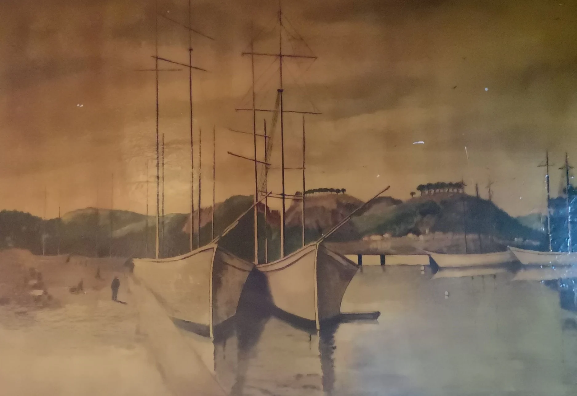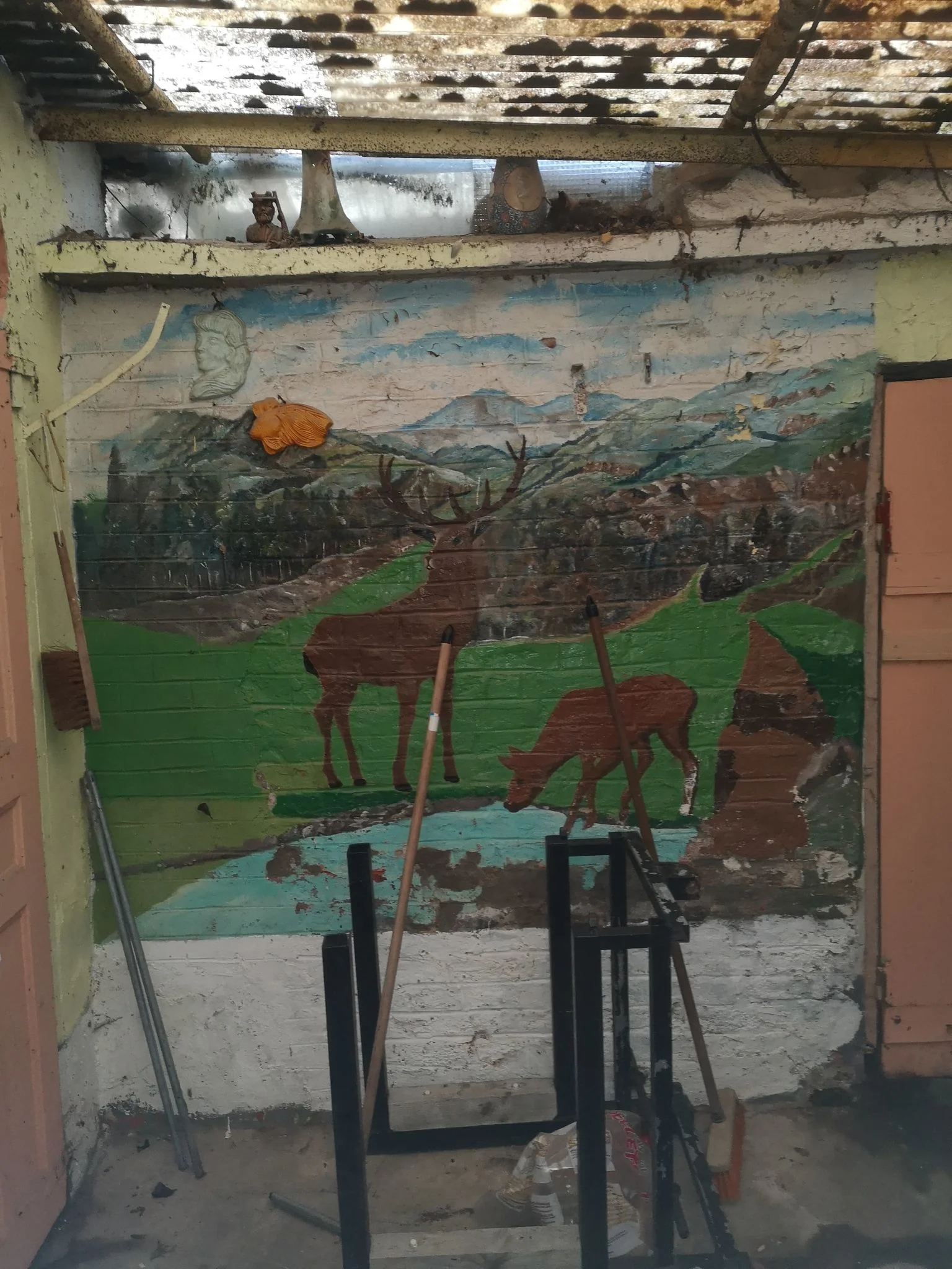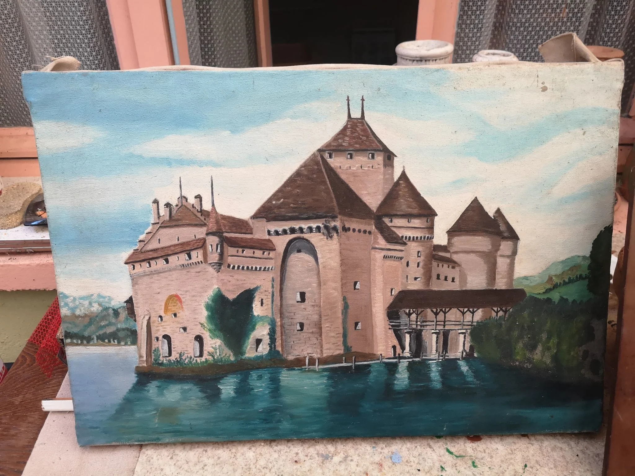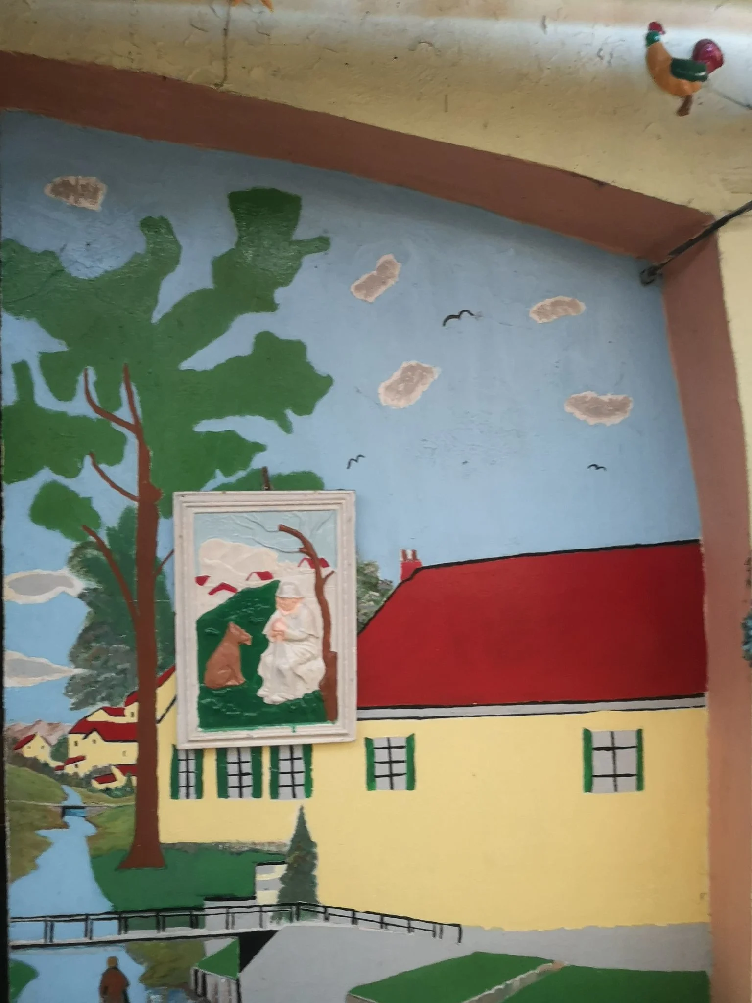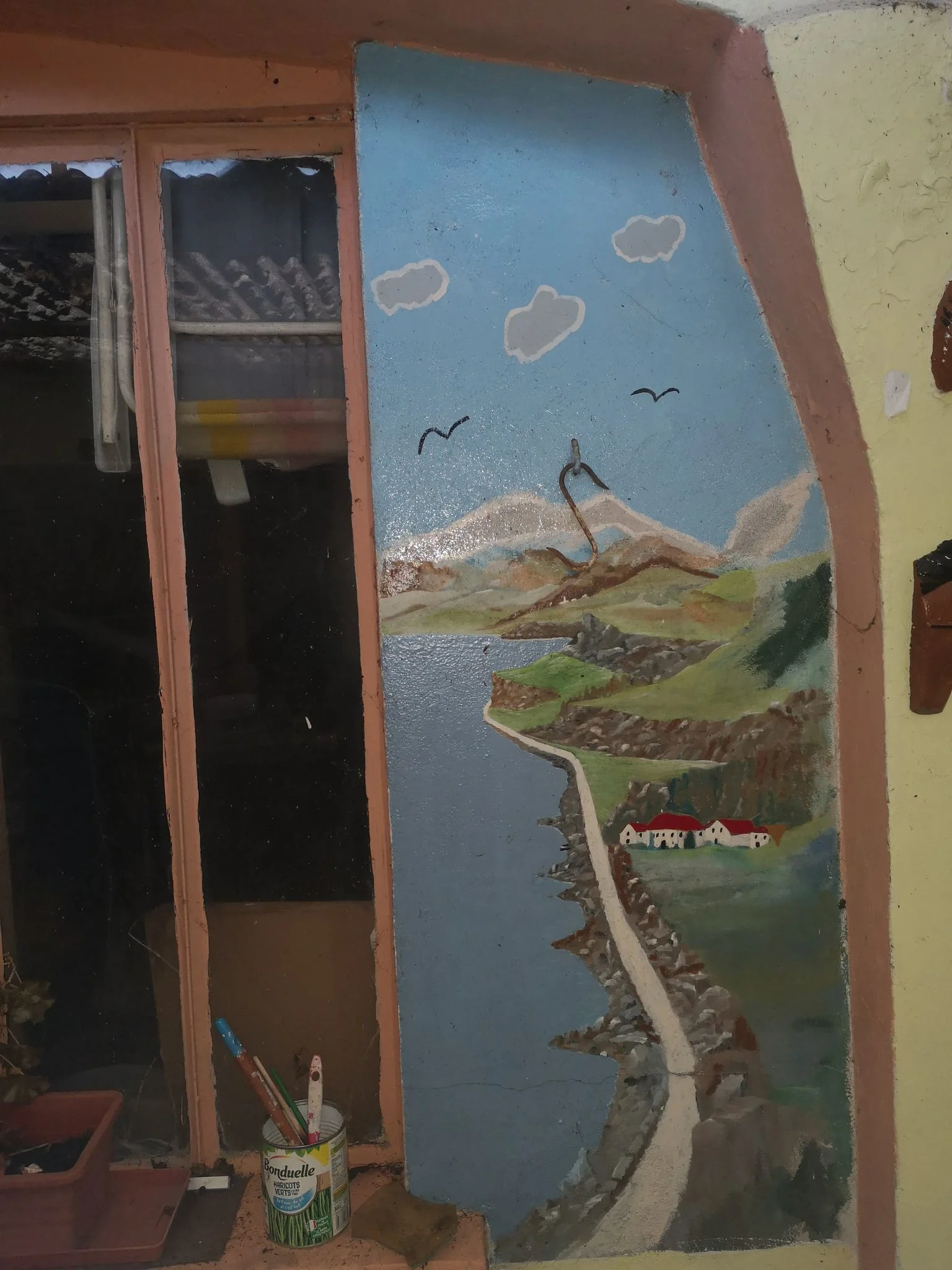 Les murs de cette cour étaient rongés par l'humidité. Sandrine m'apprit qu'un projet de réhabilitation de cet espace, dans le cadre d'un partenariat d'aide pour personnes défavorisées, était engagé. Ainsi, que deviendront ces fresques peintes lorsque les travaux auront été entrepris? Elles ont déjà pâti des infiltrations d'eau tant et si bien que Marie-Hélène s'est évertuée non sans mal à les entretenir. Elle n'a pourtant pas les mêmes dispositions plastiques que son père et pose au pinceau des aplats de couleur sur les parties endommagées dans le but de restaurer les œuvres. Il en résulte un ouvrage assez fascinant entre paysage naturaliste et aplats vifs et colorés, faisant tendre ces vues vers une certaine forme d'abstraction. J'observais depuis la rue une fresque de la même facture, vraisemblablement réalisée par M. Goldoni, dans la cour d'une maison attenante à sa propriété. Il aurait été judicieux de l'analyser de plus près afin de mieux saisir la nature des restaurations pratiquées par Marie-Hélène sur les autres œuvres de son père.