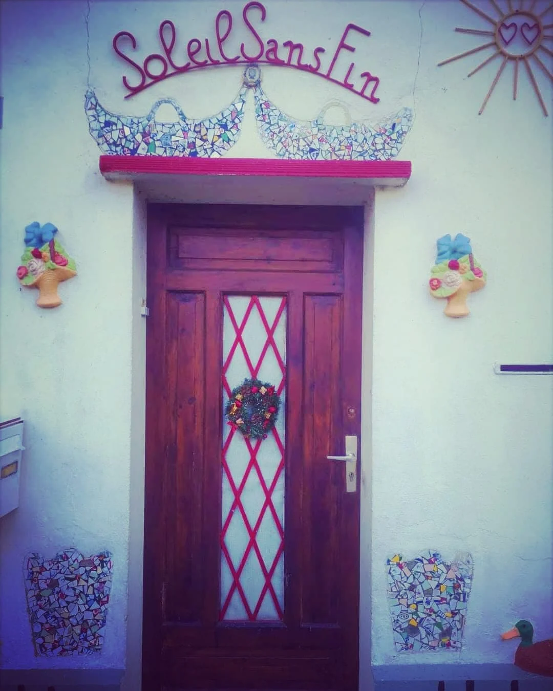 Pour finir, que dire de cette épigraphe énigmatique située au-dessus de la porte d'entrée : « Soleil sans fin ». Une citation de Mario Goldoni, figurant dans le Guide de l'art insolite du Nord Pas de Calais/Picardie de Francis David, incitait le lecteur à découvrir son sens caché: « Le jardin s'appelle Soleil sans fin. Il faut deviner ce que ça veut dire ». Léandro Barzabal, un ami présent lors de cette visite, me désigna un moule en céramique, accroché au mur d'une des pièces de l'habitation et qui avait échappé à mon attention. On y lisait l'inscription suivante tirée d'un proverbe provençal: « Un jour sans vin. Un jour sans soleil ». Cette œuvre cachée révélait au grand jour le mystère de son incarnation!