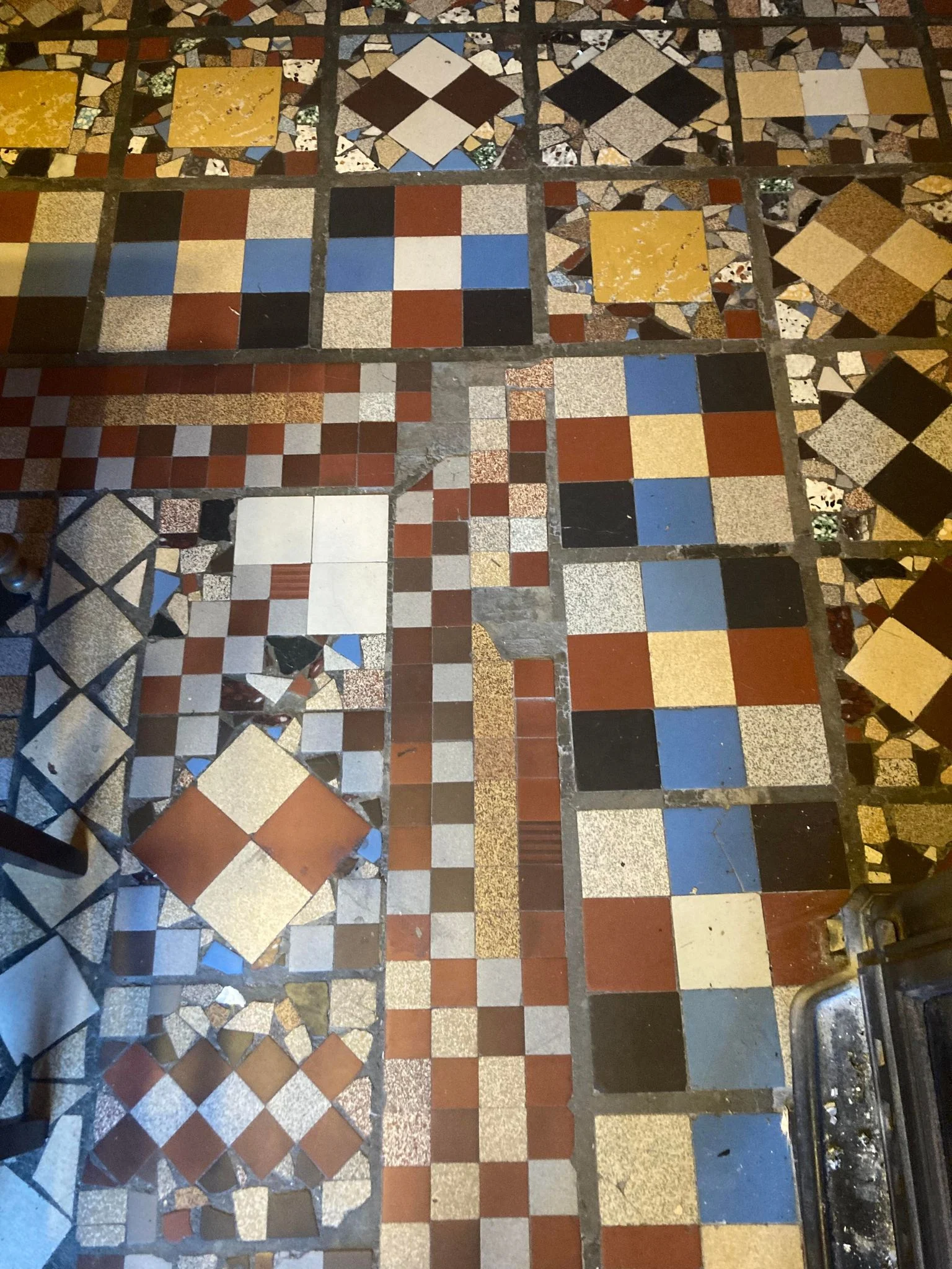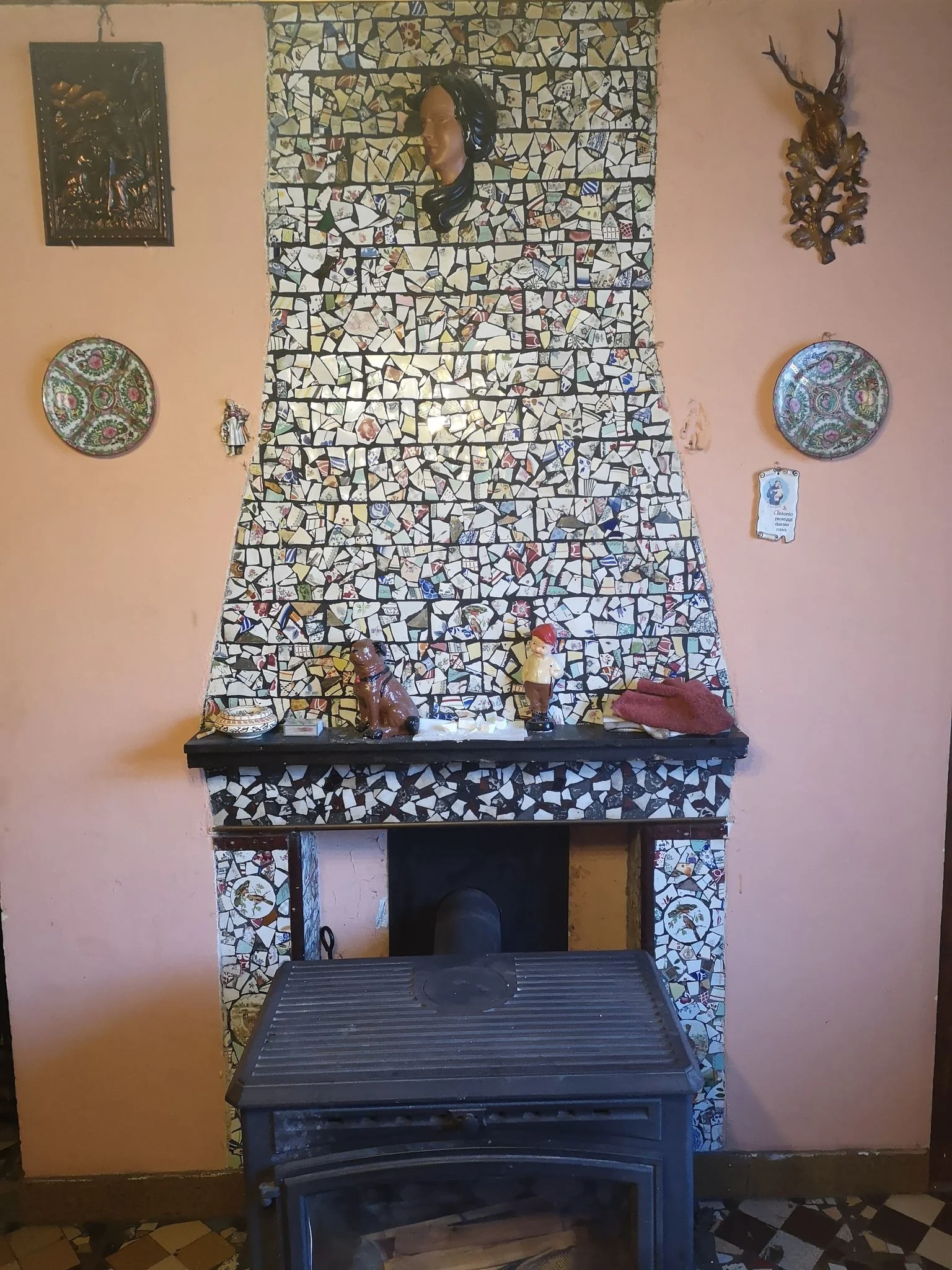 Je compris alors que les changements de couleur opérés sur les sculptures et les moules confectionnés par Mario lui étaient imputables. Elle « s'amuse », selon ses termes, à les changer de place ou à les re-pigmenter. Ne serait-ce pas une façon de redonner vie à ces êtres de ciment en les sortant ainsi de leur morne torpeur? Marie-Hélène m'apprit que les personnages situés au niveau de l'entrée de la maison furent réalisés entre 1956 et 1958, soit près de 70 ans de cohabitation entre une danseuse, un homme victorieux et une chèvre. Ils auraient été sculptés d'après imagination pense-t-elle. L'art de la statuaire de jardin a toujours été très prisé en Italie et Mario rendait hommage par là-même à une tradition décorative ancestrale. Il en va de même pour l'art de la mosaïque. Mario récupérait dans les chantiers et les décharges la faïence cassée nécessaire à l'élaboration de ses ornementations murales. Les sols de la maison étaient pavés de carreaux de ciments disparates donnant à cet habitat de fortune une touche très singulière.