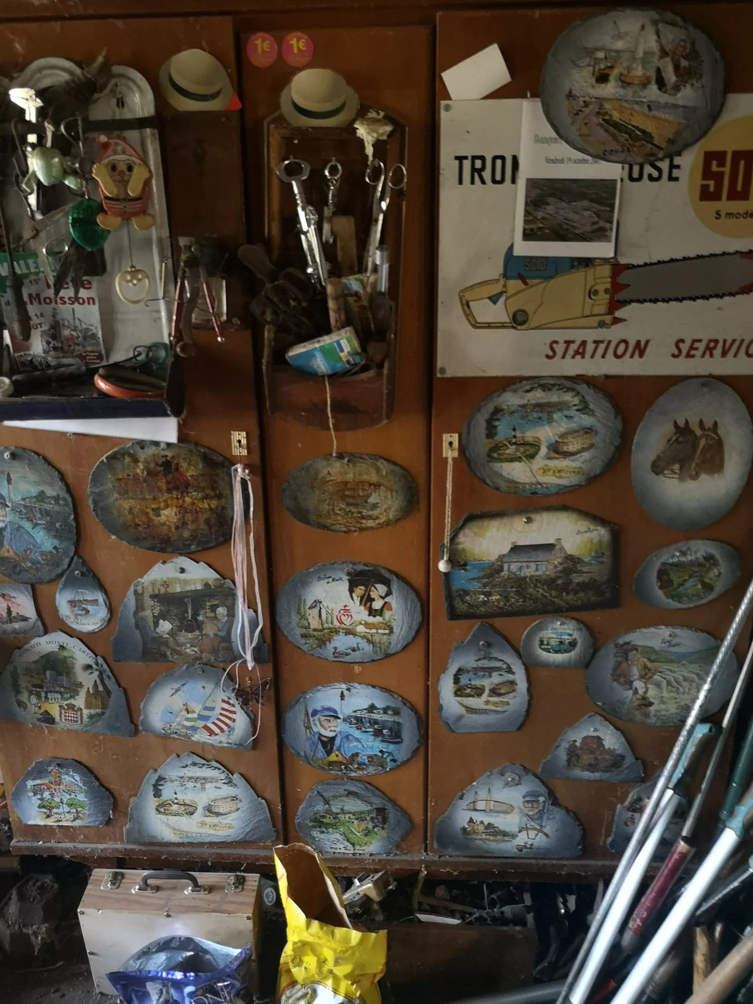 Contrairement aux informations collectées à son sujet sur Internet, Michel m'assure que les briques les pierres et ardoises n'étaient pas présentes sur le terrain au moment de son acquisition. Il a apporté tous ces matériaux en glanant ça et là, effectuant des allers et retours dans les déchetteries. A l'origine il n'y avait que des arbres sur ce terrain. Quelques habitants du coin lui ont apporté des matériaux pour ériger ses tas. Force est de constater que Michel a toujours eu le goût de l'accumulation. Il me montre une importante collection de cartes postales regroupées dans des albums photos soigneusement rangés. Son garage faisant office d'atelier-débarras s'apparente à un petit musée d'objets récupérés classés et catégorisés. On y retrouve pléthore d'outils agricoles, de tableaux, d'horloges, de plaques décoratives peintes, de porte-clés, de bâtons de berger qui a lui-même taillés... Il semble enfin déterminé à se séparer de tous ces objets encombrants et à remettre de l'ordre dans sa maison.