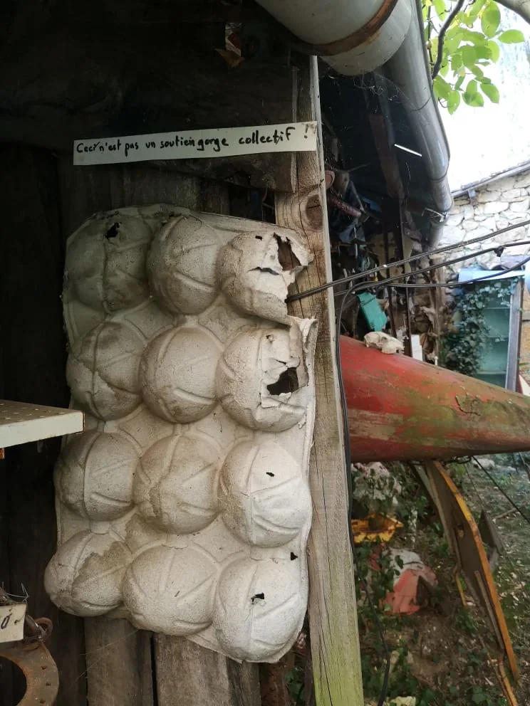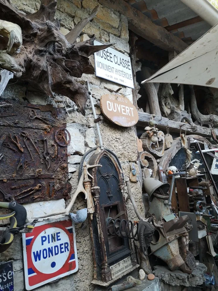 La maison-musée de l’insolite de Bertrand Chenu est nichée au pied de la falaise de Rochecourbe à 3kms du village de Cabrerets. Son musée est véritablement accolé à la paroi de la roche. L’ombre de la falaise plane sur cet environnement exceptionnel. Lorsque j’arrive sur le site, Bertrand est déjà à l’entrée de sa maison-musée qui se trouve au bord de la route : il peste et fulmine contre des automobilistes qui viennent de ralentir en prenant des photos de sa maison alors que les photos sont réservées aux visiteurs du musée et non pas aux curieux qui souhaitent prendre un cliché rapide depuis la vitre de leur véhicule. Un panneau l’indique bien dès l’entrée du site. L’entrée est à prix libre. Après avoir payé, Bertrand reste à disposition des visiteurs mais nous laisse faire la visite en solitaire.