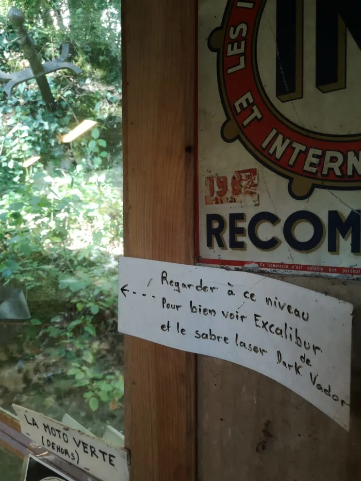 La suite de la visite se fait dans le jardin pour un changement d’échelle assez radical. Après avoir admiré pléthore d’artéfacts de petites dimensions on découvre un environnement aux vastes sculptures et installations. Le long de la paroi rocheuse, sur le flanc de falaise, on y aperçoit des motards, effrayantes répliques contemporaines des cavaliers de l’apocalypse, ou des guerriers déchainés du film Mad Max. On retrouve à l'extérieur le gout de la collection, de l’inventaire et du détournement chers à Bertrand Chenu. Certaines installations sont monumentales comme cette voiture désossée dont la carrosserie a été déployée telle une peau de bête tendue sur un panneau. Cette installation m’a fait une très forte impression et aurait tout à fait sa place dans un musée d’art contemporain. On se demande alors comment il a pu démantibuler un tel engin....